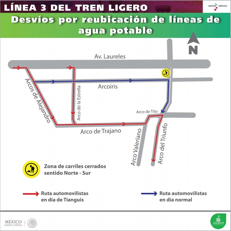 Durante los miércoles, en el horario en el que se instala el tianguis sobre la calle Arco Iris de la colonia Arcos de Zapopan, los conductores que transiten de Tesistán hacia Zapopan tendrán que dar vuelta a la derecha en las calles Arcos de Alejandro o Arco de la Estrella, para girar a la izquierda en Arco de Trajano y tomar Arco Valeriano hacia la izquierda, virando a la derecha por Arco de Tito, para retomar Arco del Triunfo.