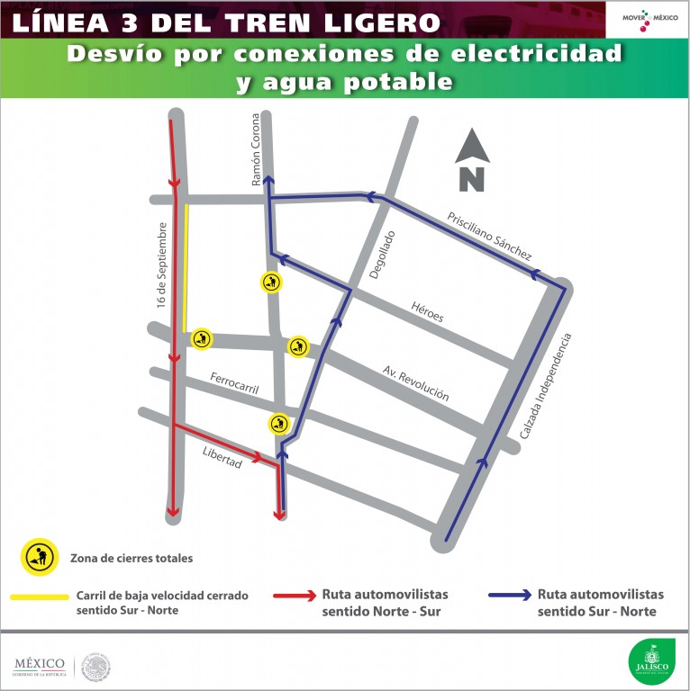 Las rutas de desvió para los que circulan de sur a norte sobre la avenida Ramón Corona, serán la calle Degollado, dando vuelta a la izquierda en Héroes para continuar sobre dicha vialidad.