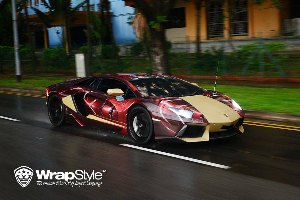 La personalidad excéntrica de Tony Stark puede verse plasmada gratamente en un Lamborghini Aventador con una pintura metálica en tonos rojizos y amarillos, tal como la armadura de Ironman.