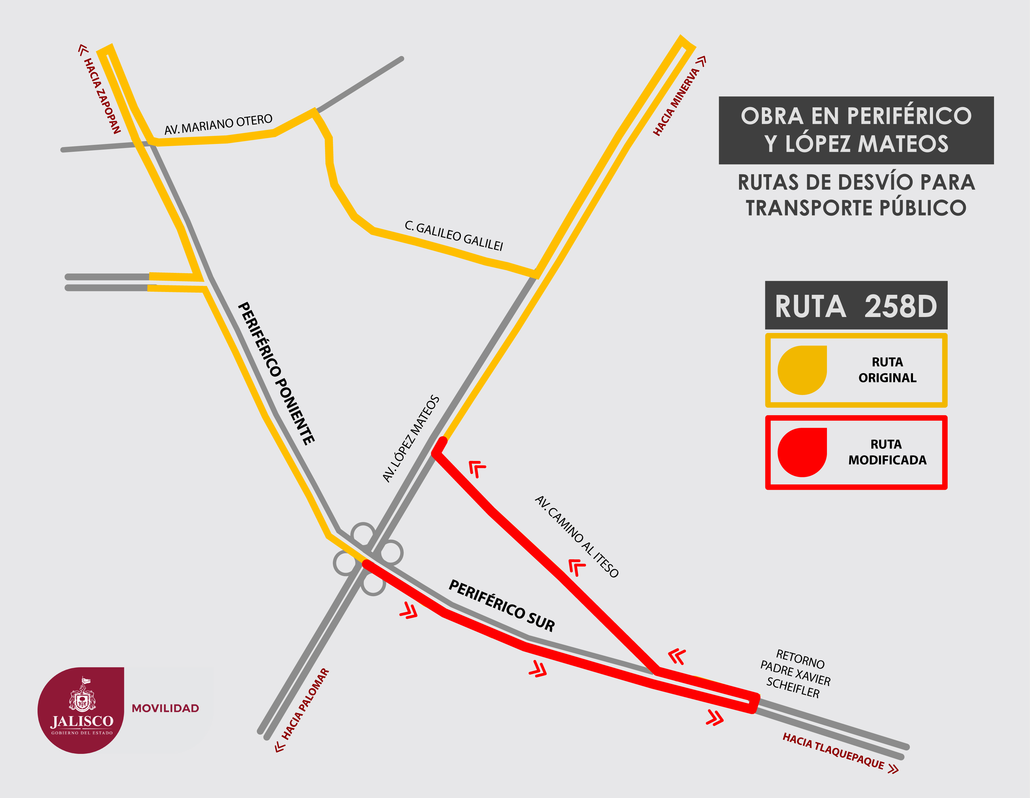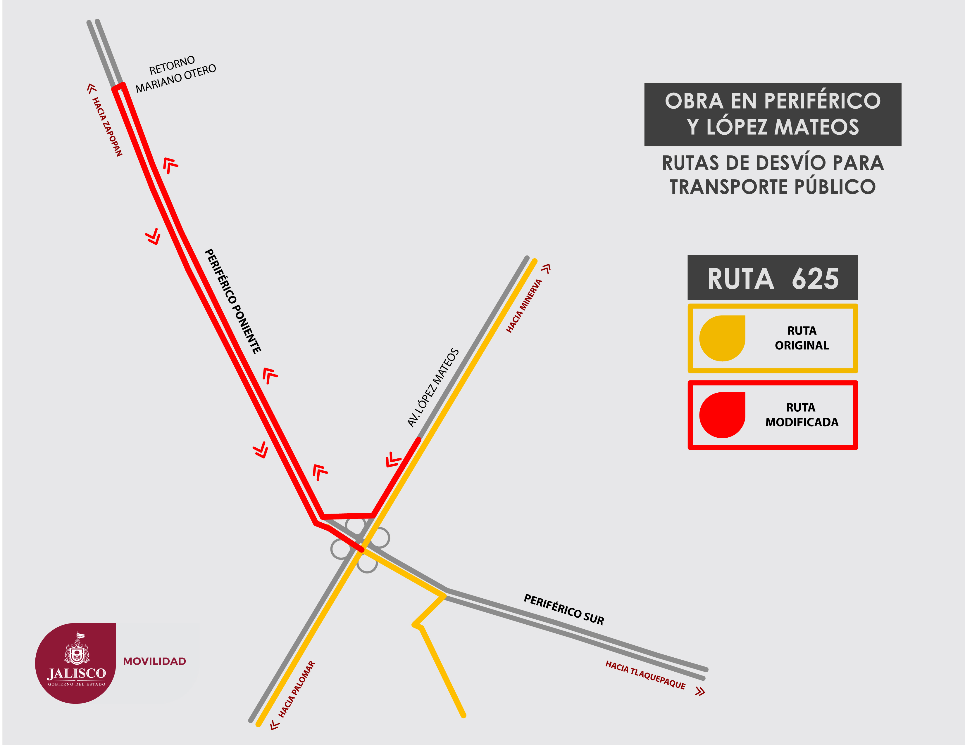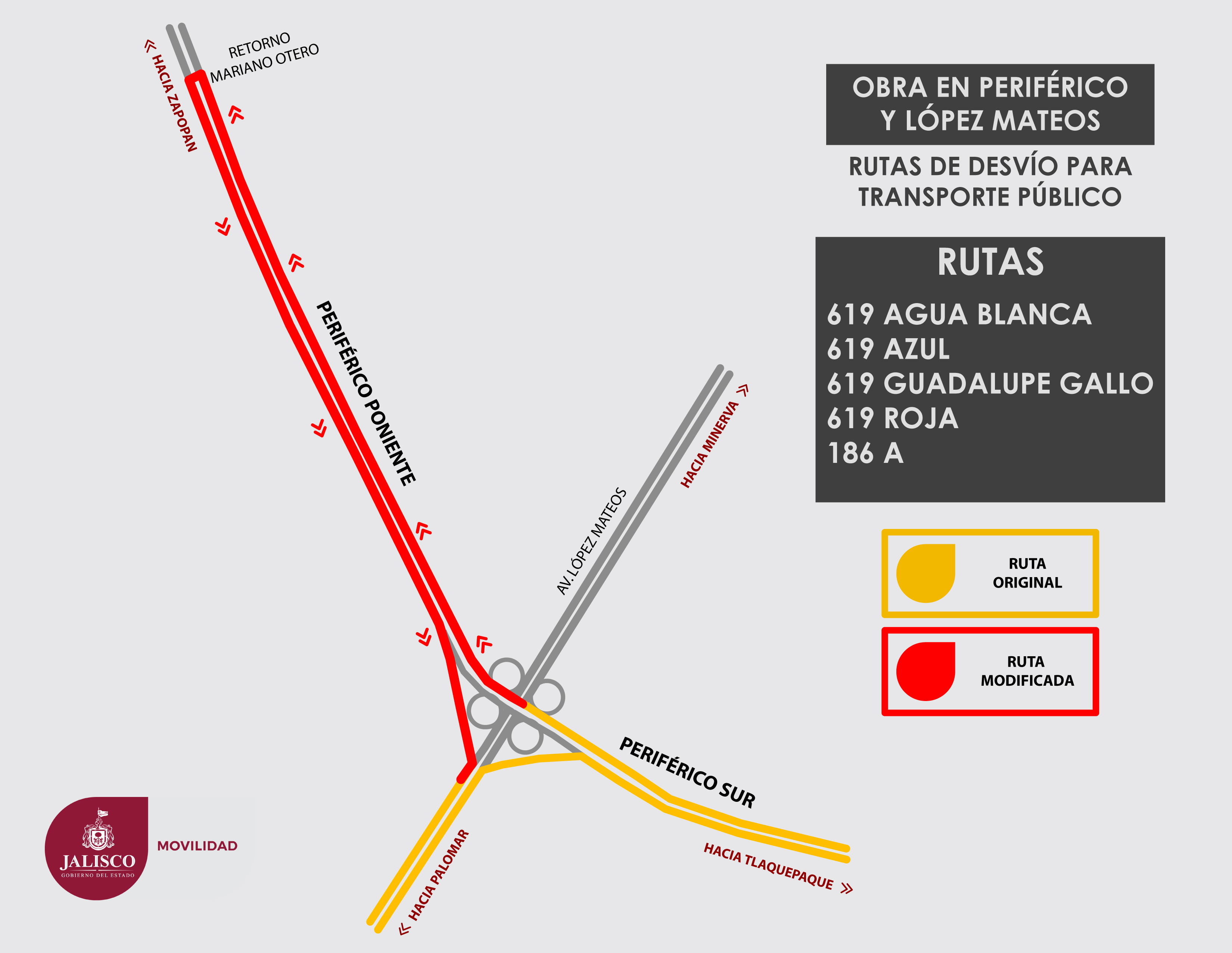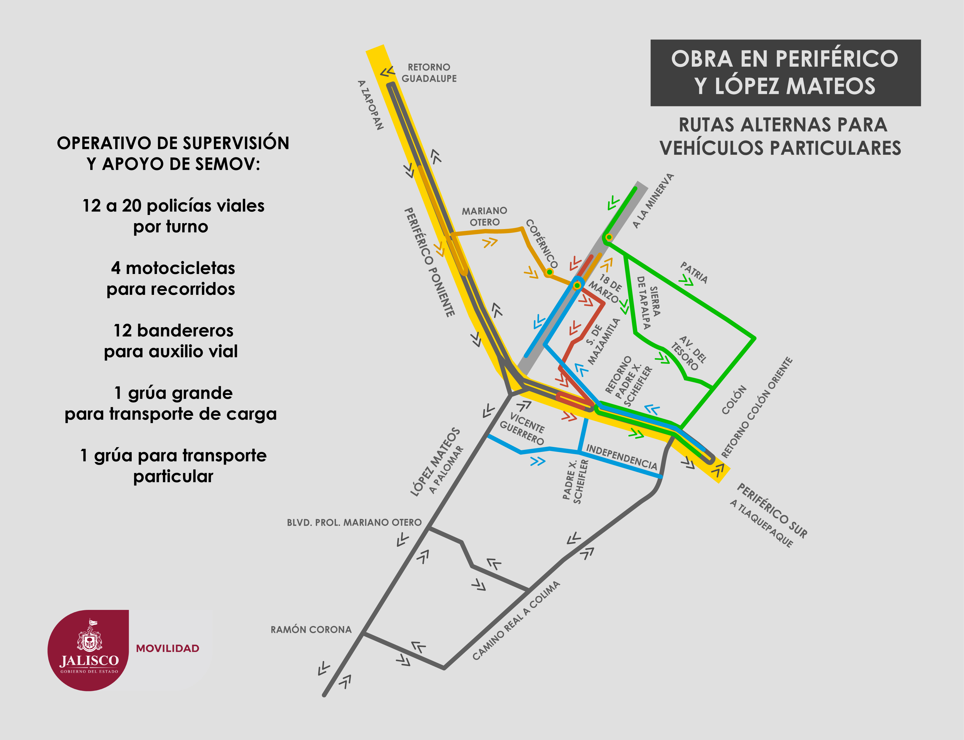 La intervención iniciará en los carriles Poniente – Oriente de Periférico (en el sentido de Mariano Otero a Colón) y luego se hará el cambio a los carriles del sentido opuesto. Como parte de los trabajos, se deberá apuntalar el puente vehicular colocando andamios en su parte baja, para lo cual se tomará un carril central en el sentido de López Mateos y el acotamiento.