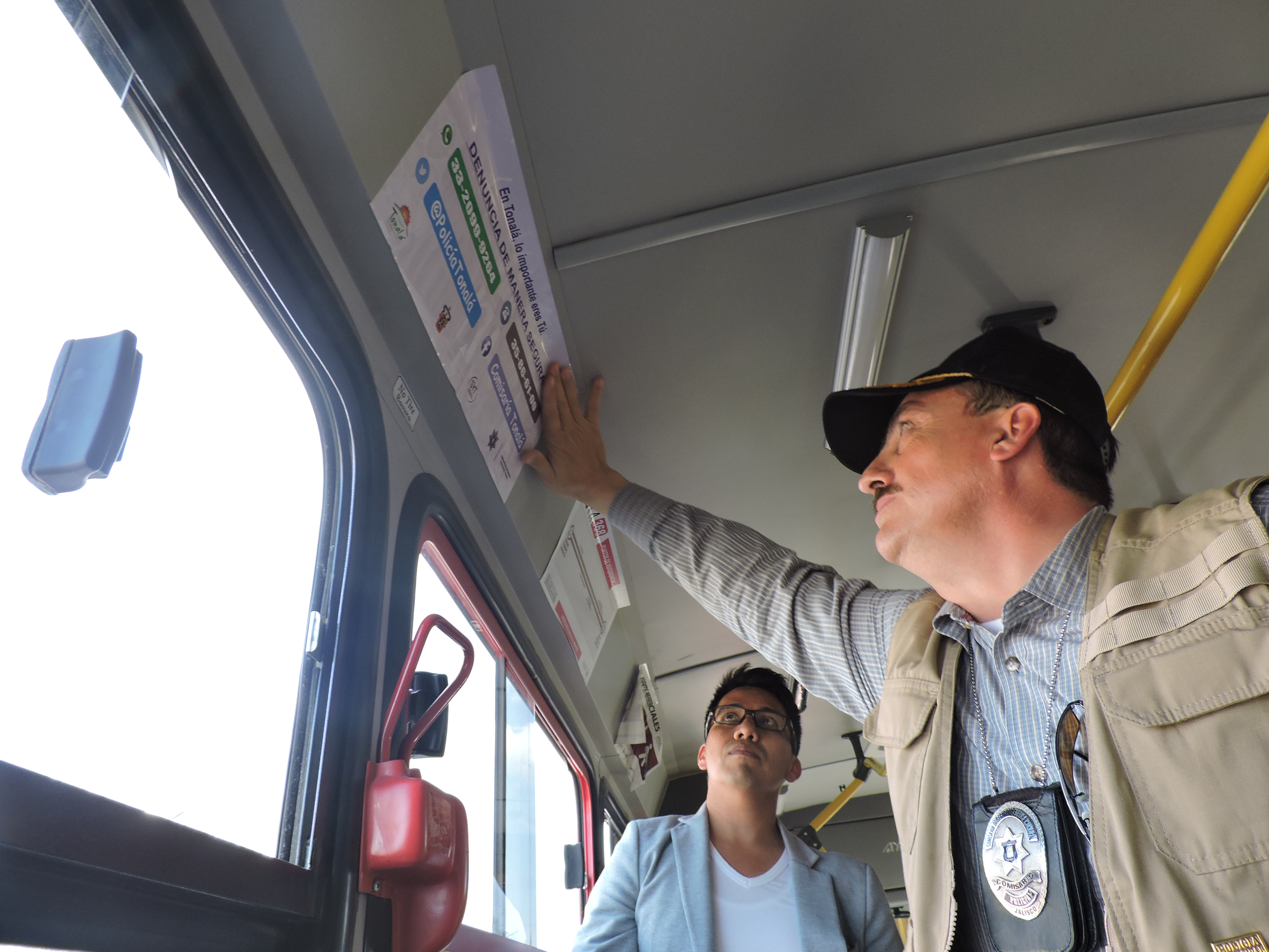 Desde este lunes, subieron a diversas unidades del transporte público de la ruta 368 para la pega de calcomanías en donde están estampados los números de emergencia de la Policía Municipal así como las redes sociales y WhatsApp en donde se podrán recibir sus reportes de manera anónima.