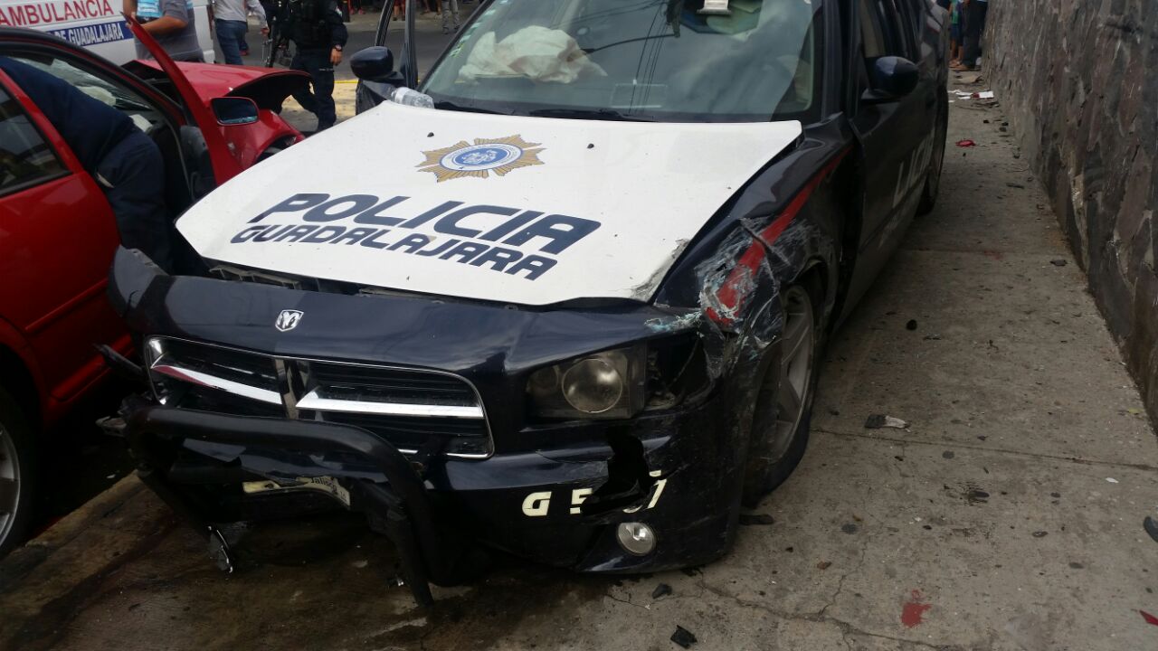 Un fuerte choque entre una patrulla de la Policía de Guadalajara y un vehículo particular dejó saldo de tres personas lesionadas, dos oficiales y un menor de edad.