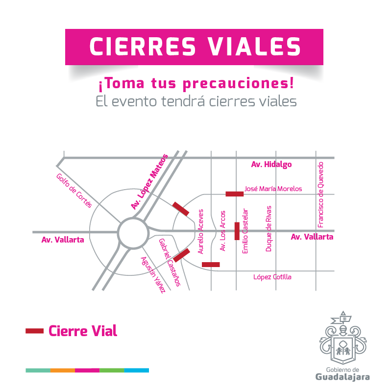 La Avenida Vallarta tendrá un corte a la circulación desde Emilio Castelar, mientras que Arcos cerrará desde López Cotilla, y la propia Emilio Castelar también será cerrada desde Morelos.