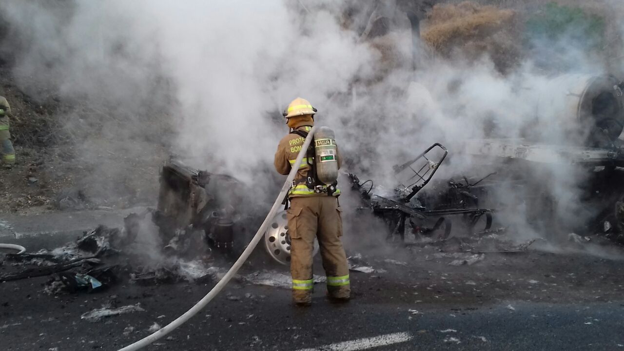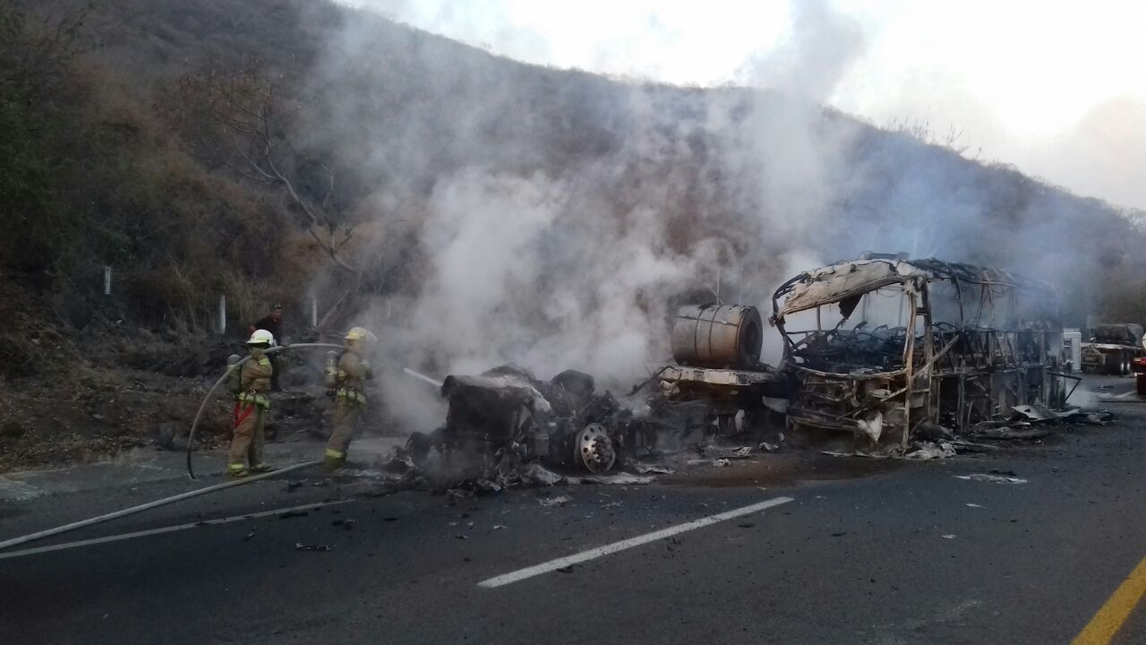 Los hechos ocurrieron este sábado sobre el Kilómetro 3 de la mencionada vía en el sentido que va de Colima a Guadalajara a la altura de Acatlán de Juárez, cuando un camión de pasajeros y un tráiler chocaron lo que provocó el posterior incendio en los vehículos.