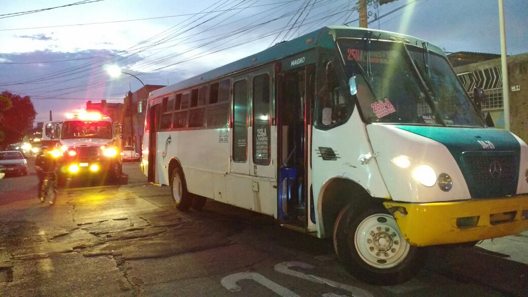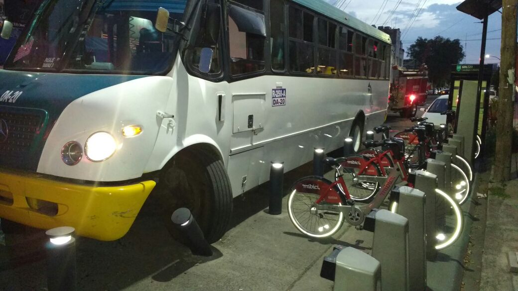 La ruta 110 impactó de costado a la ruta 258 y esta se impactó contra un bolardo de una estación de MiBici. Resultan 4 personas lesionadas; tripulantes de la unidad de transporte público que fueron atendidos por servicios médicos municipales. Los afectados firmaron el desistimiento para esperar el pase médico de la aseguradora.