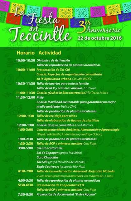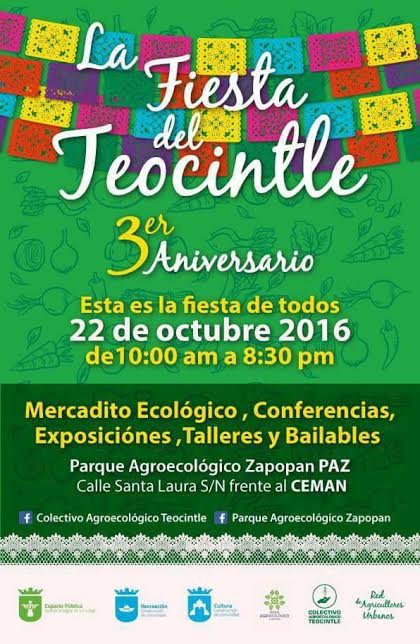 El Parque Agroecológico de Zapopan y el Colectivo Agroecológico Teocintle, celebrarán este sábado la fiesta del Teocintle, la cual se organiza buscando crear conciencia sobre la existencia de la capacidad del ser humano para generar sus propios recursos que le permitan subsistir (alimentos, utensilios), la unión de la comunidad, la tierra, el trabajo y nuestras tradiciones.