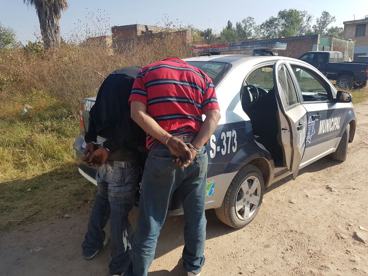 Elementos de la policía de El Salto detuvieron a dos personas mientras desmantelaban un vehículo robado.