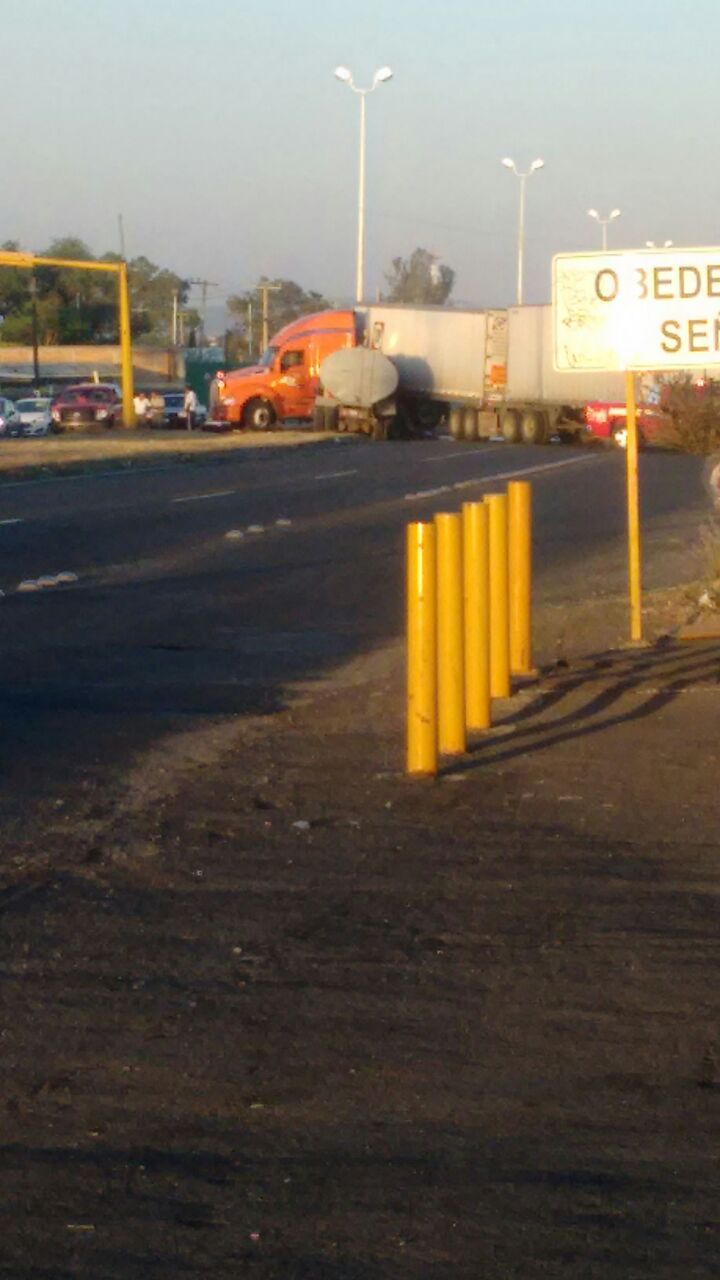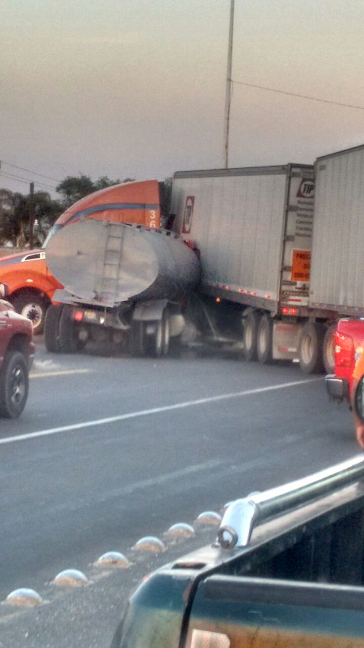 El lugar exacto del percance fue justo frente a la empresa Alen. Aparentemente el tráiler pretendía virar para retornar, cuando la pipa se impactó en su costado.