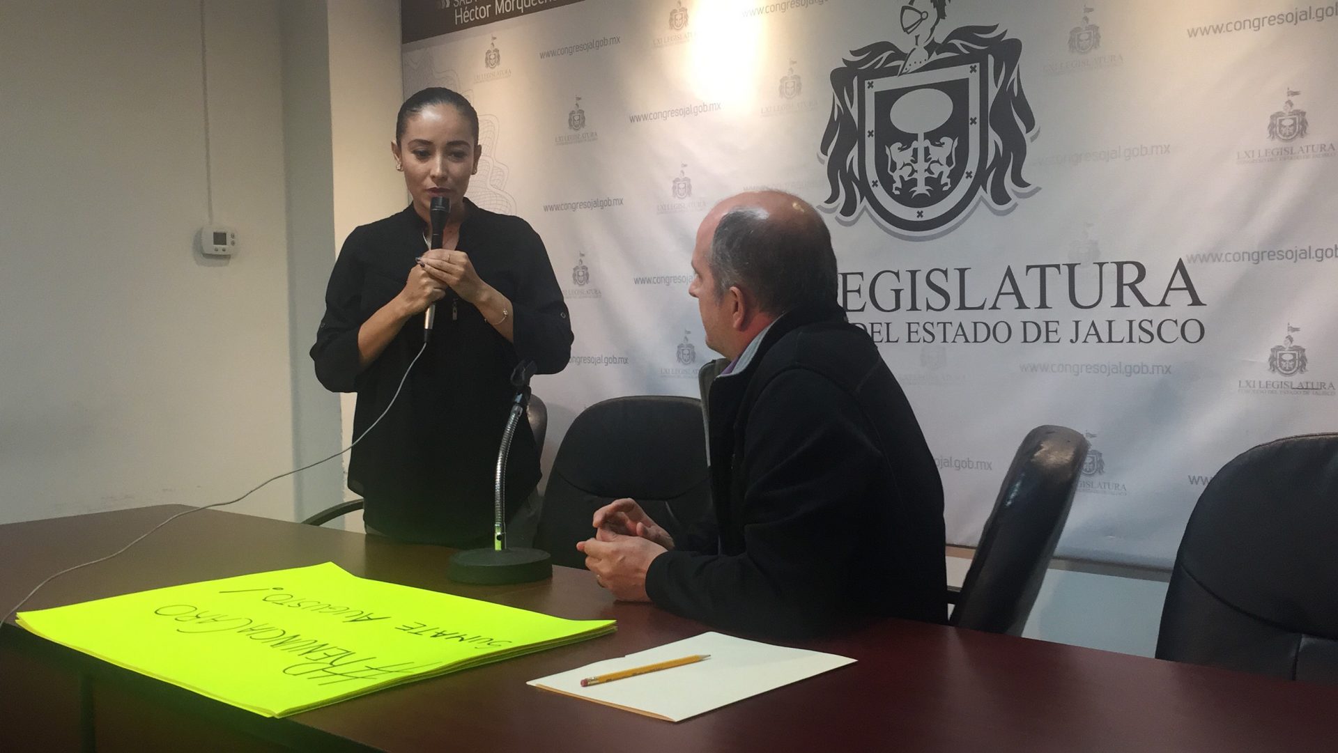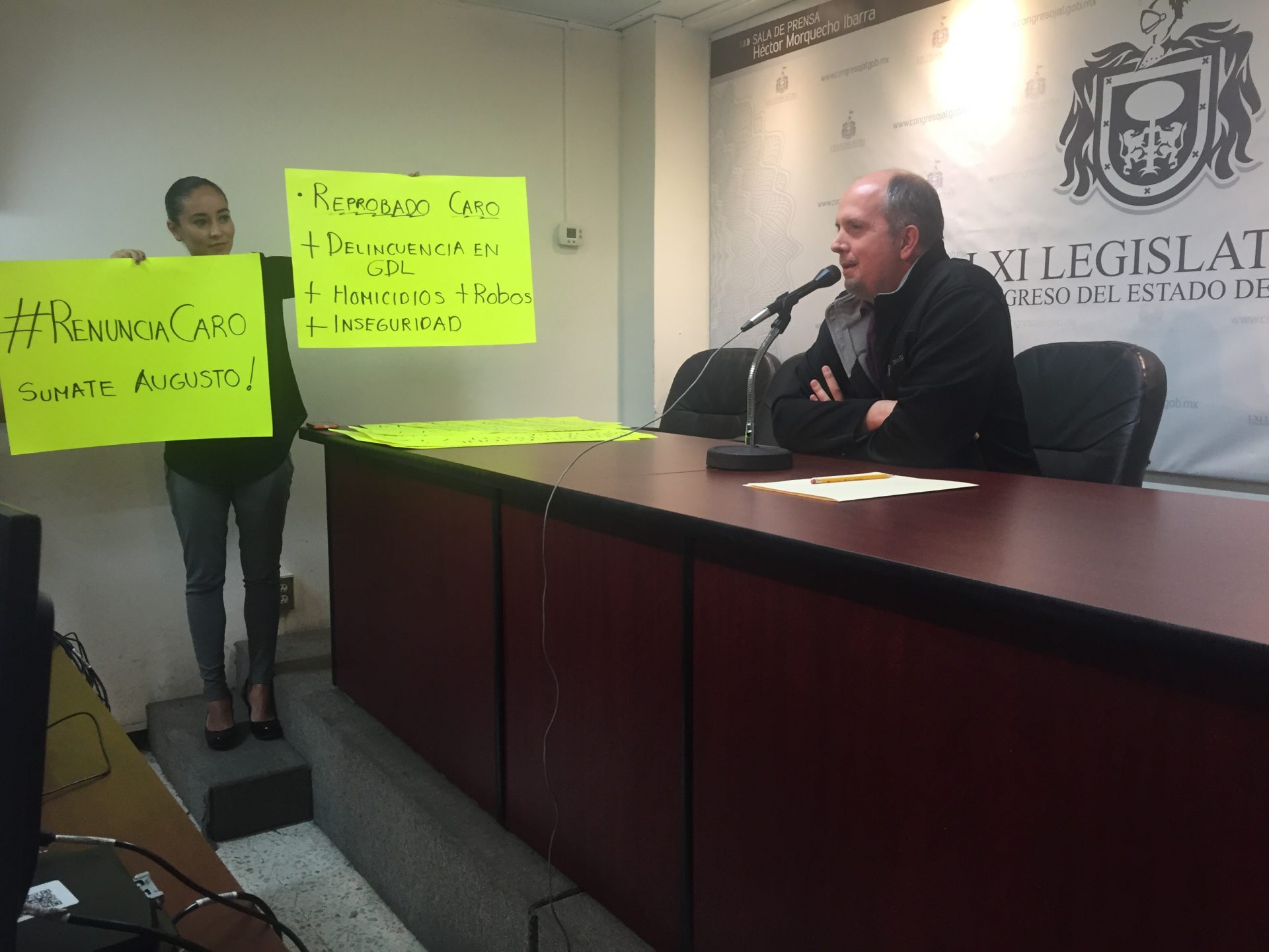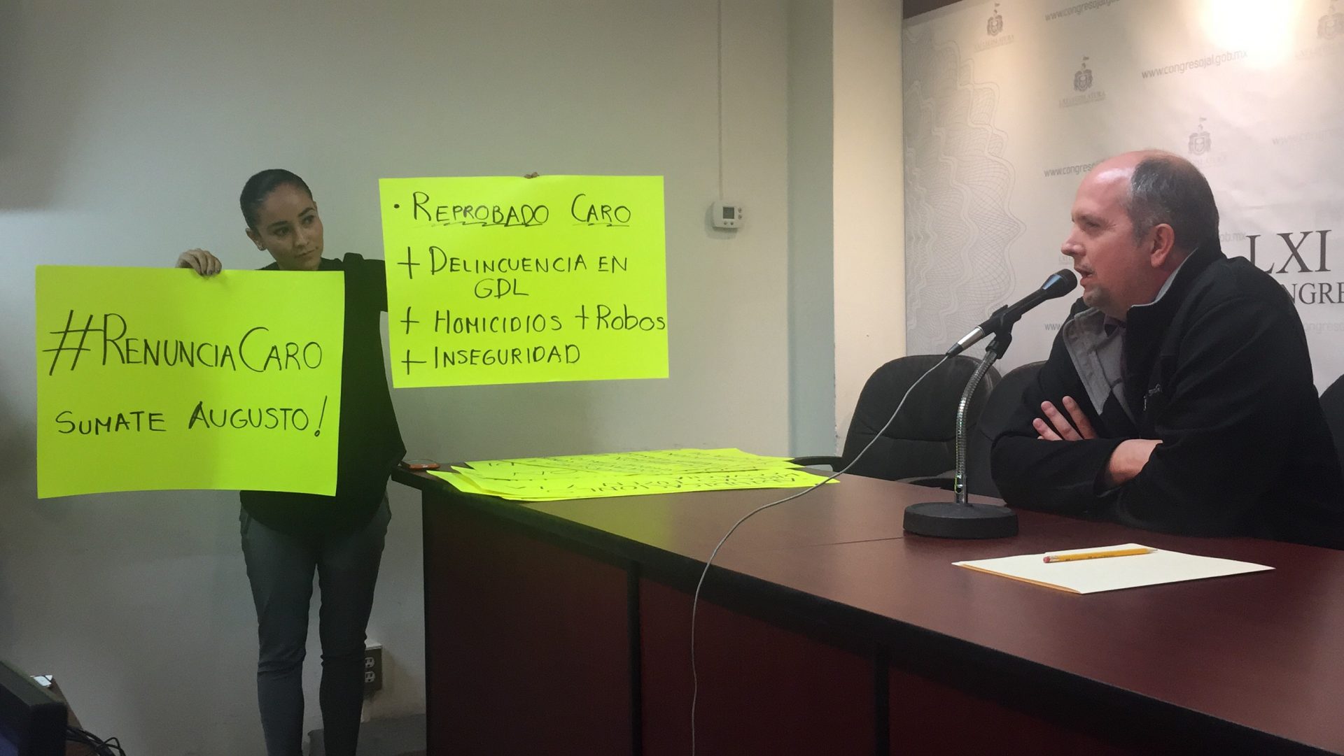 Durante la rueda de prensa del diputado emecista, Augusto Valencia, la regidora priísta de Guadalajara, Ángeles Arredondo irrumpió en las instalaciones de la sala de prensa del Congreso del Estado, para realizar una protesta y exigir la salida del Comisario de seguridad de Guadalajara, Salvador Caro.