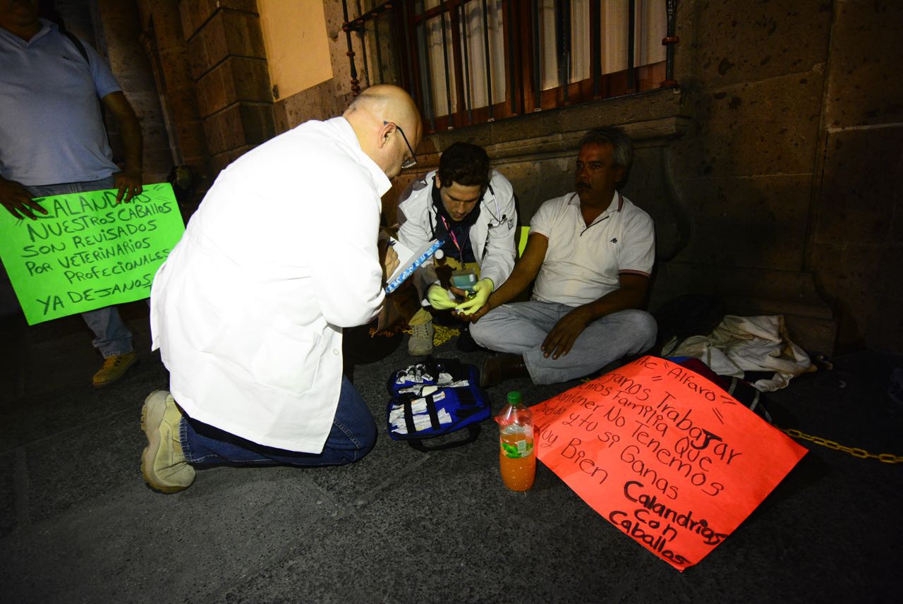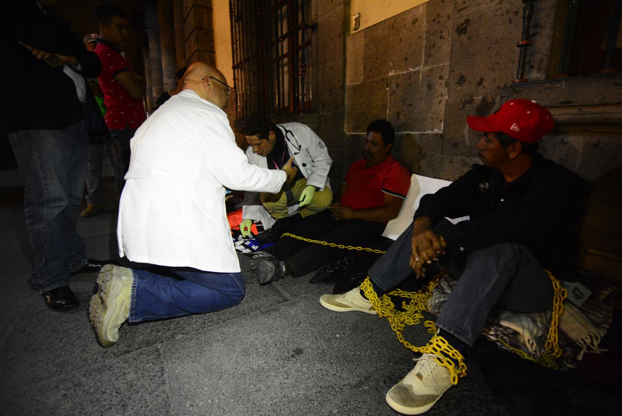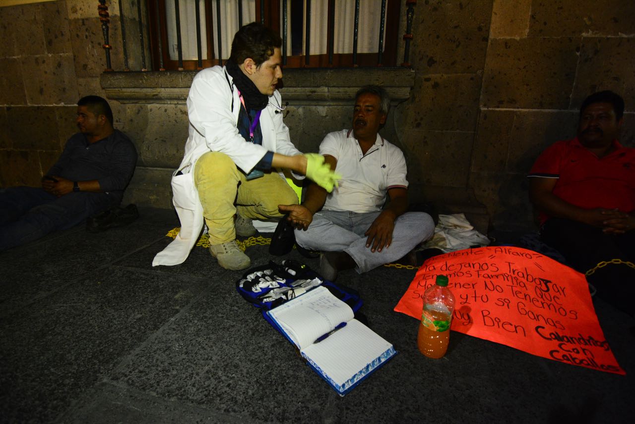 Personal de Servicios Médicos Municipales revisaron el estado de salud de los calandrieros que se mantienen en huelga de hambre a las afueras del Palacio Municipal. Los inconformes se encuentran en buen estado de salud y según informó el Gobierno de Guadalajara, su salud será monitoreada de manera permanente.
