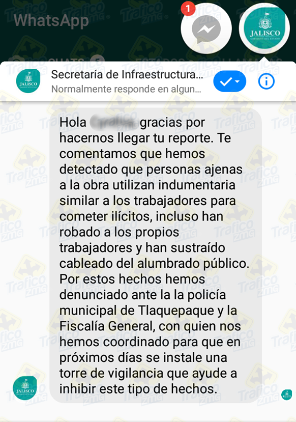 La Secretaría de Infraestructura no mencionó desde cuándo han tenido este tipo de reportes, no obstante aseguraron que han interpuesto las denuncias correspondientes ante la Policía de Tlaquepaque y la Fiscalía General del Estado.