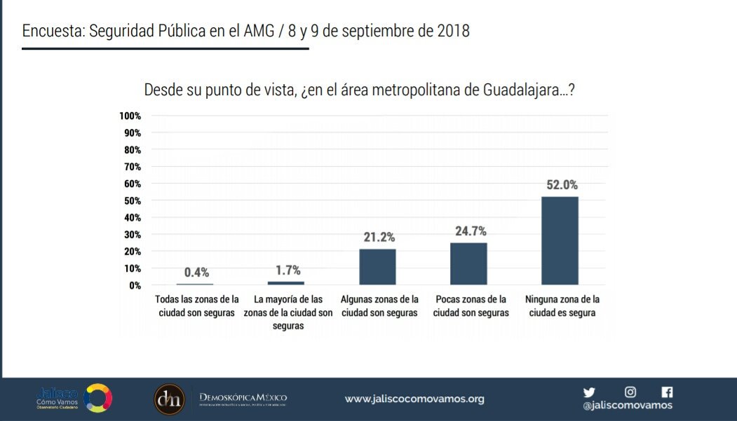 Entre los datos más interesantes es que 52 por ciento de los tapatíos consideran que no existe ninguna zona de la ciudad que se pueda considerar segura, mientras tan solo el 1.7 por ciento considera que la mayoría de las zonas de la urbe se pueden considerar seguras.