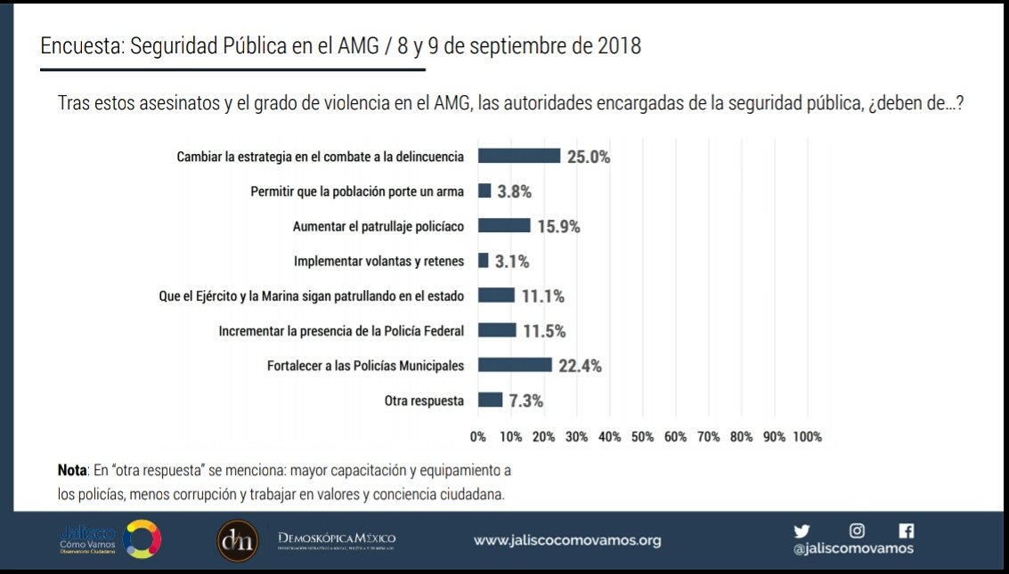 Luego de los asesinatos de policías e la ciudad se preguntó a los ciudadanos sobre qué deben hacer las autoridades ante estos hechos violentos, y el 25 por ciento consideró que se debe cambiar la estrategia de combate a la delincuencia, mientras que 22.4 por ciento aseguraron que se deben fortalecer a las policías municipales.
