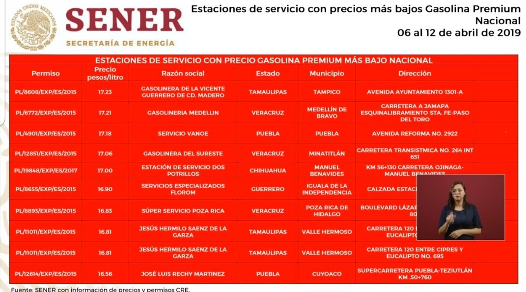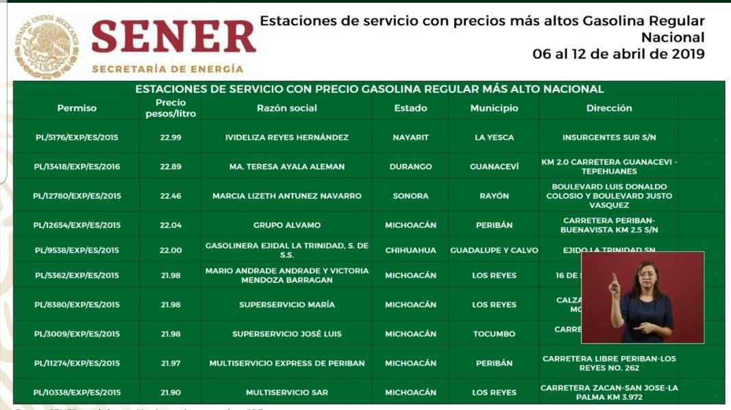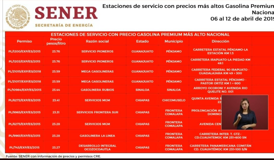 En la rueda de prensa se mostró en específico cuáles son los establecimientos que venden más cara la gasolina en todo el país, y también la que tiene el precio más económico. En el caso de la más costosa se encuentra en el municipio de La Yesca en Nayarit.