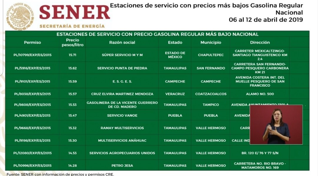 La titular de la Secretaría de Energía, Rocío Nahle, presentó los precios de la gasolina regular (la que por muchos años se conoció como Magna), según la medición hecha del 6 al 12 de abril de este año.