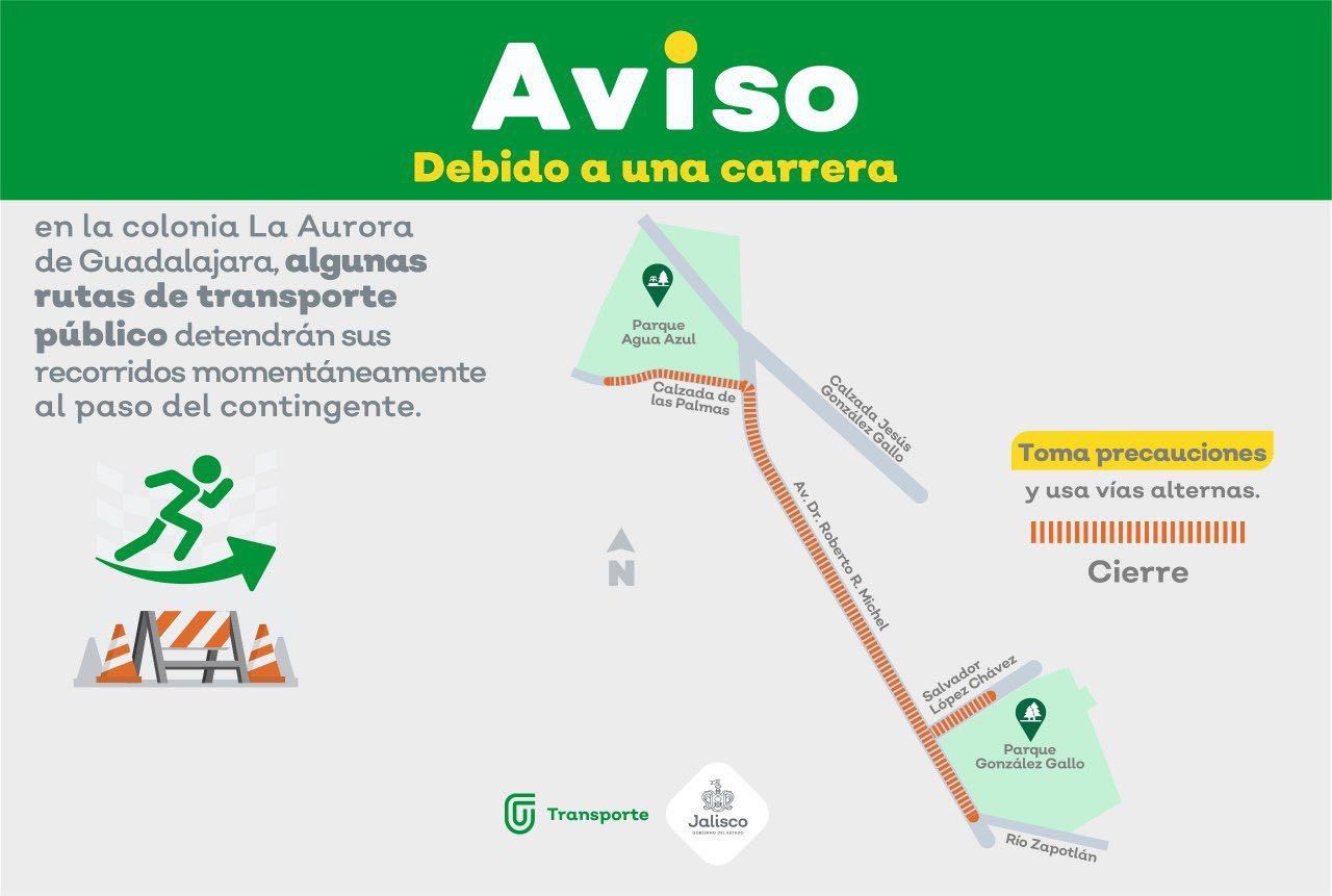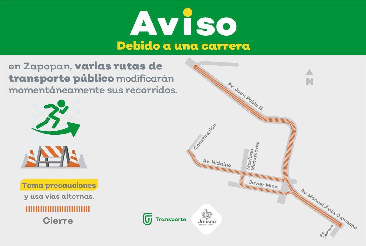 Debido a dos carreras deportivas que se realizarán el domingo 10 de diciembre, algunas rutas del transporte público detendrán su recorrido al paso del contingente de corredores y otras modificarán su derrotero original, esto en Guadalajara y Zapopan.