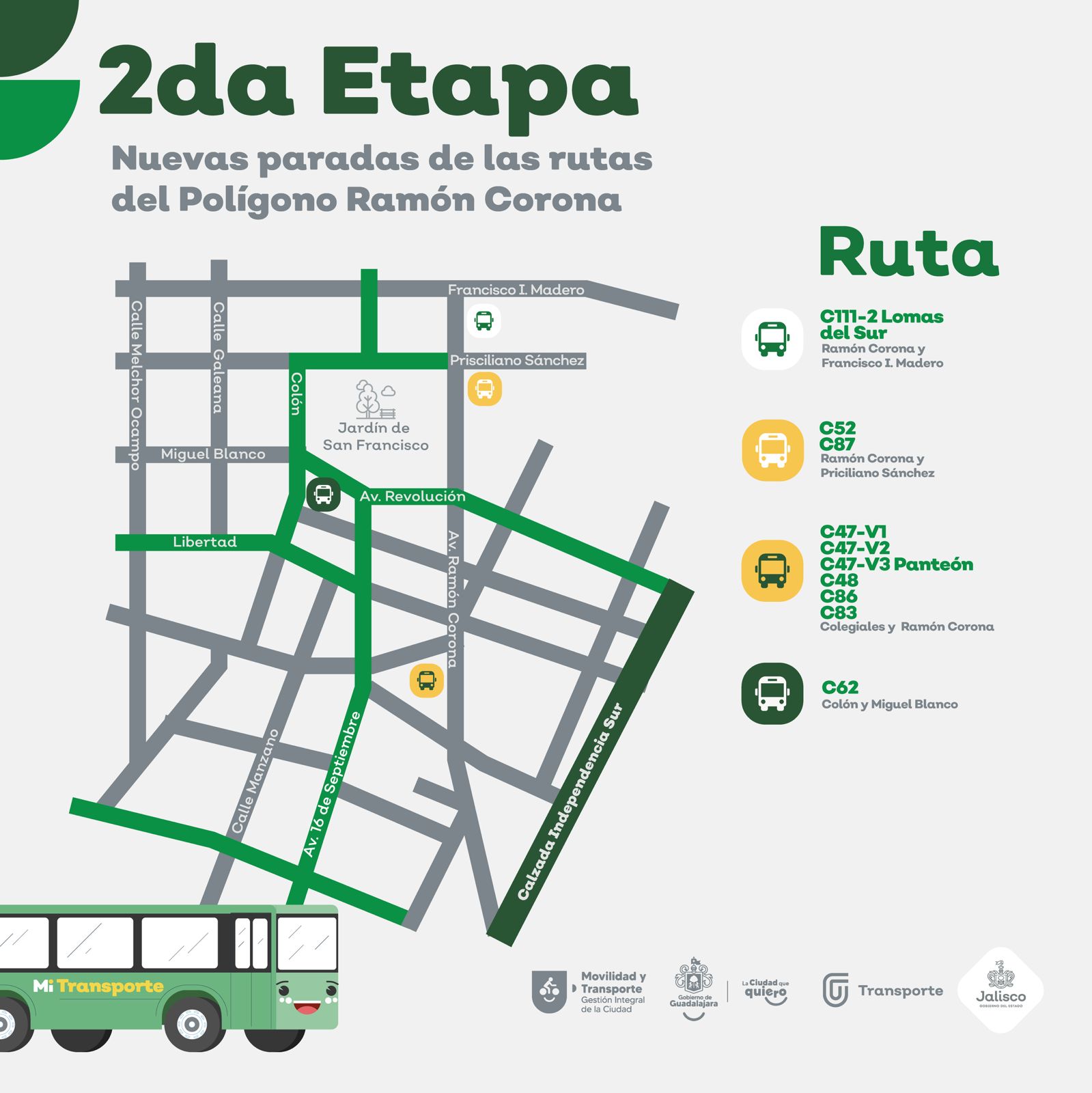 ● Rutas C52 (antes 647A) y C87 (antes 647) tendrán su parada en la esquina de Ramón Corona y Prisciliano Sánchez.