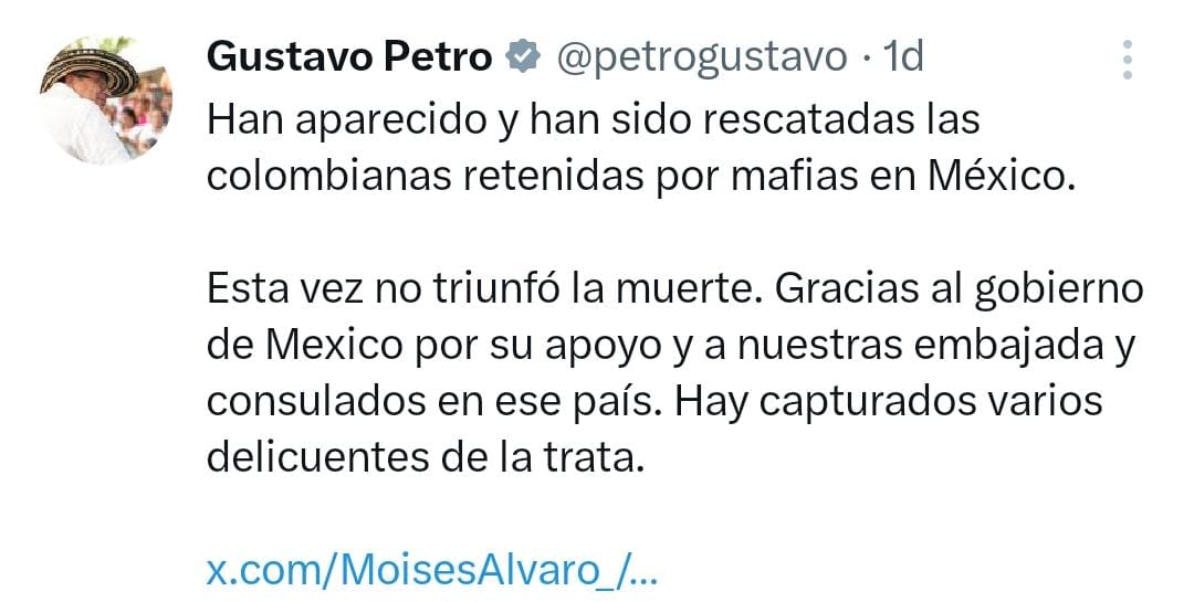 “Han aparecido y han sido rescatadas las colombianas retenidas por mafias en México (…) Hay capturados varios delincuentes de la trata”, indicó el presidente Gustavo Petro