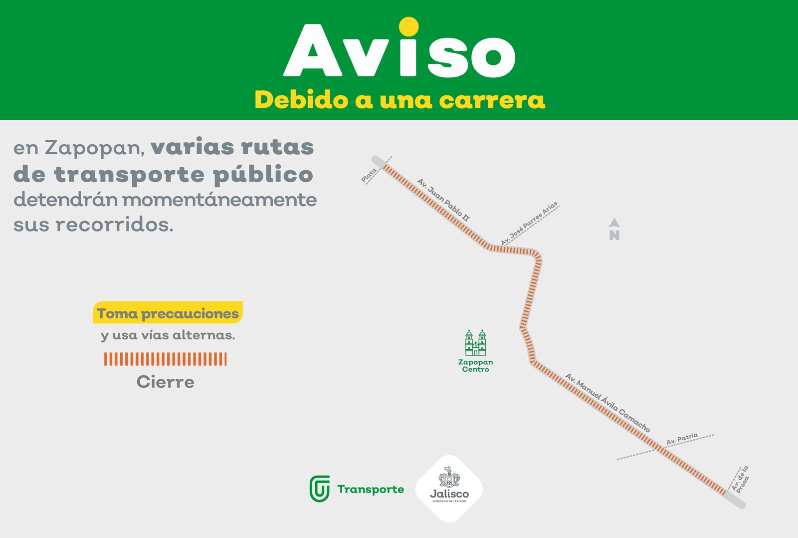 El próximo domingo, la colonia Tepeyac de Zapopan será testigo de una carrera deportiva que afectará momentáneamente el servicio de varias rutas de transporte público. Desde las 6:45 a. m., diversas líneas suspenderán sus recorridos en la avenida Juan Pablo II / avenida Manuel Ávila Camacho, desde la calle Plata hasta la avenida de la Presa en ambos sentidos.