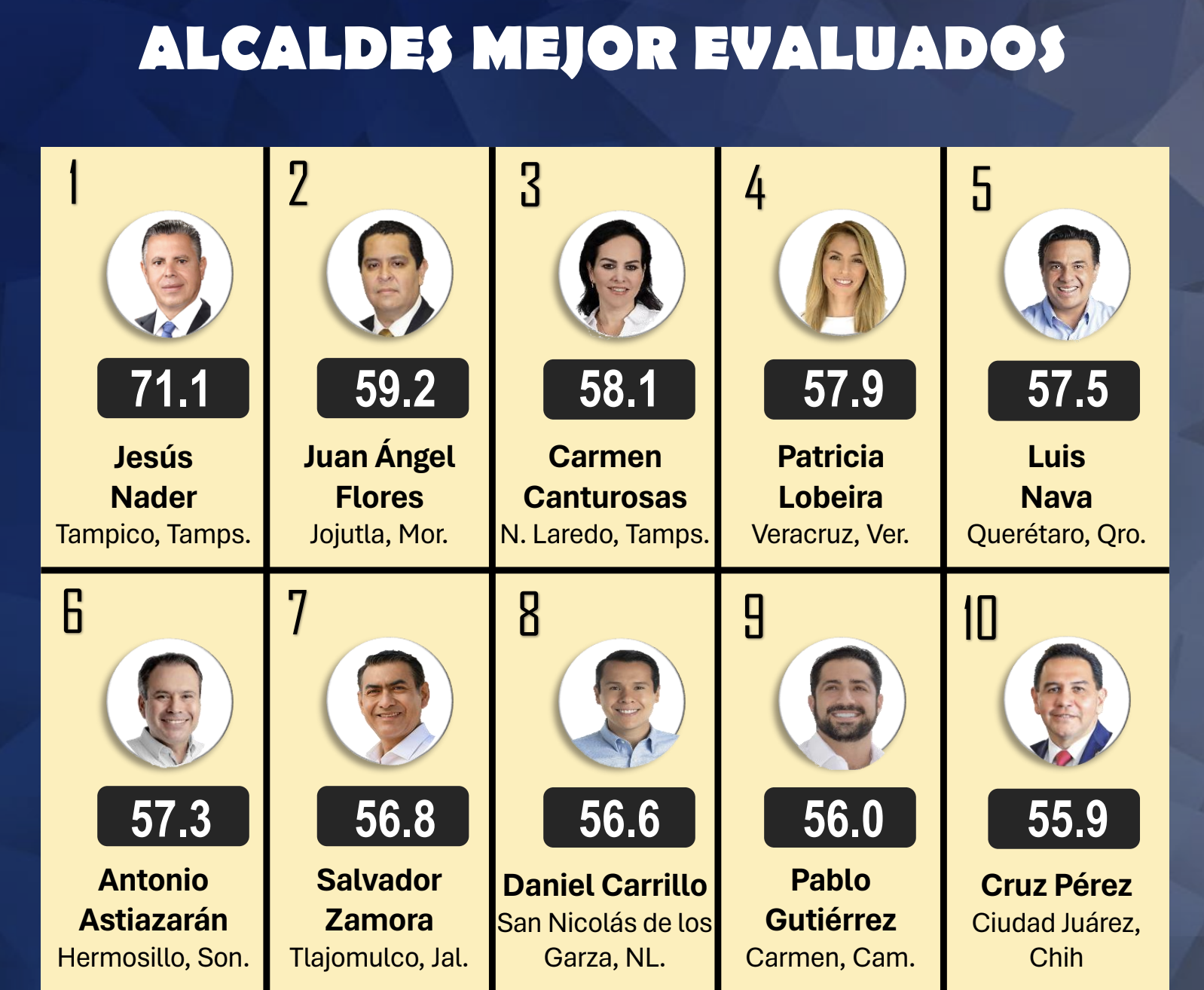 En primer lugar se encuentra Jesús Nader, alcalde de Tampico, Tamaulipas (71.1 por ciento); en segundo y tercer lugar se ubicaron Juan Ángel Flores, de Jojutla, Morelos (59.2 por ciento) y Carmen Canturosas de Nuevo Laredo, Tamaulipas (58.1 por ciento).