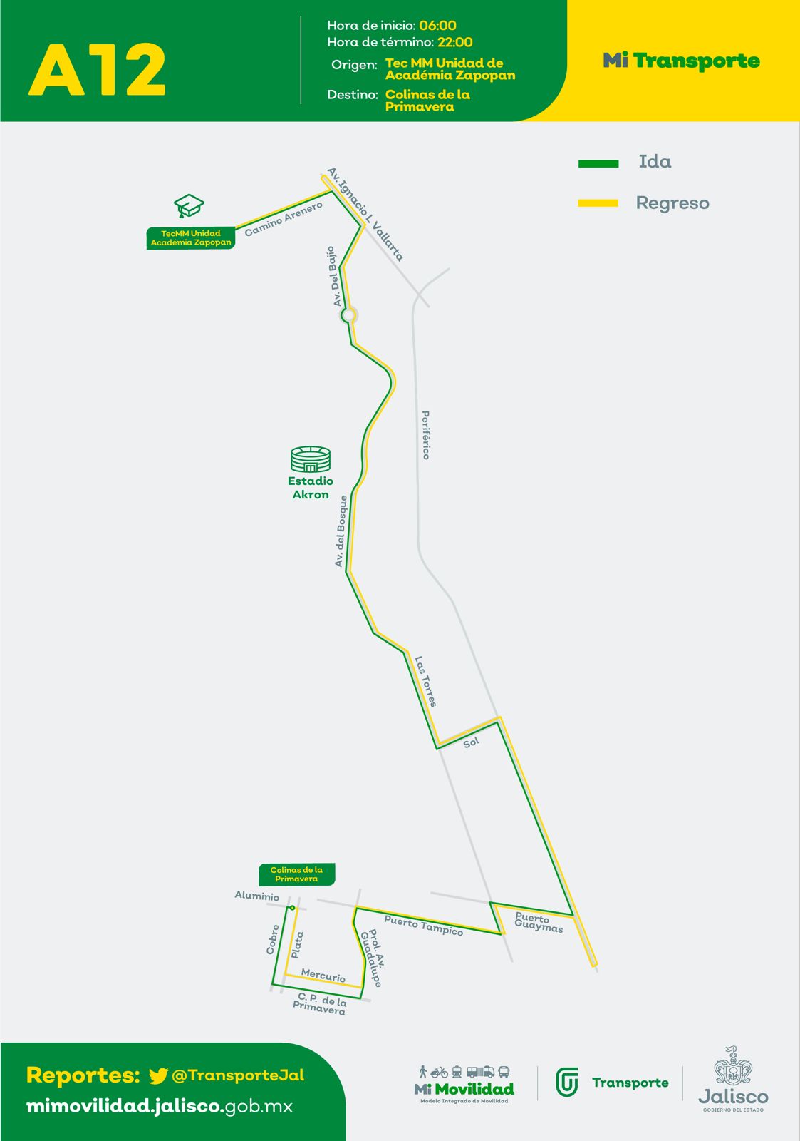 En su camino de ida, la ruta iniciará a las afueras de la institución educativa, tomará la calle Camino Arenero, para incorporarse a la derecha en avenida Vallarta, después, girará a la derecha sobre avenida del Bajío, pasará cerca del estadio Akron, continuará por avenida del Bosque y avenida Las Torres, girará a la izquierda en calle Sol (prolongación avenida Guadalupe) hasta la lateral del Periférico, donde circulará hasta la calle Puerto Guaymas, en avenida Las Torres dará vuelta a la izquierda, para incorporarse después en calle Puerto Tampico, luego girará otra vez a la izquierda, en Guadalupe hasta calle Paseo de la Primavera, luego la calle Cobre, y terminará su recorrido en calle Aluminio de la colonia Colinas de la Primavera.