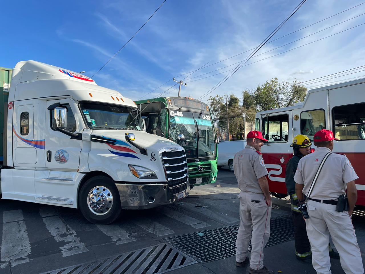 Una unidad del transporte público de la ruta C-46 del transporte público y un tráiler de doble remolque chocaron sobre el cruce de la avenida Miguel López de Legaspi y la calle Juan Bautista en la colonia La Higuerilla en Guadalajara.