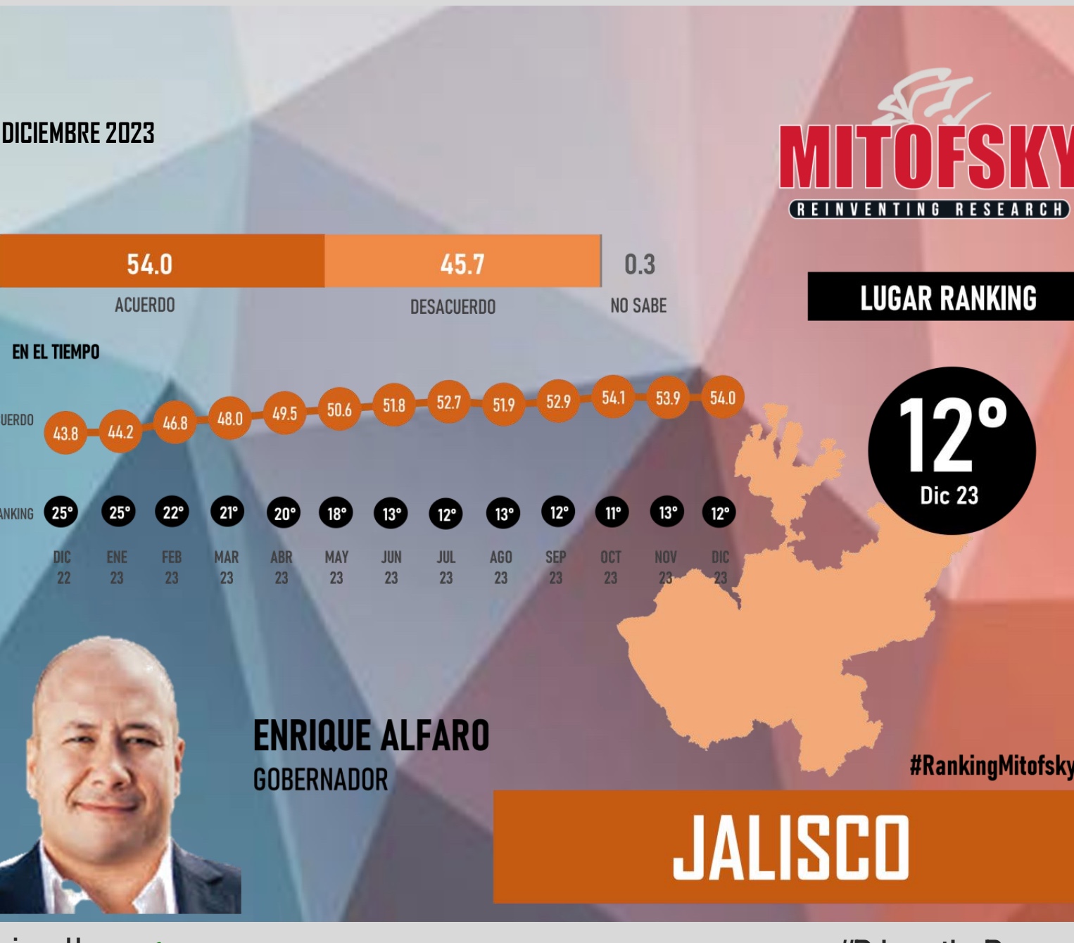 En cuanto a Jalisco, el gobernador Enrique Alfaro subió sus niveles de aprobación, colocándose entre los gobernadores mejor aprobados de México al cierre de 2023, subiendo en el último año, más de 10 puntos en su aprobación. En diciembre de 2022, Alfaro Ramírez contaba con 43.8 puntos ubicándose en el lugar 25 del ranking, mientras que en diciembre de 2023 su aprobación subió a los 54 puntos, colocándose en el lugar número 12 de los gobernadores mejores aprobados del país.