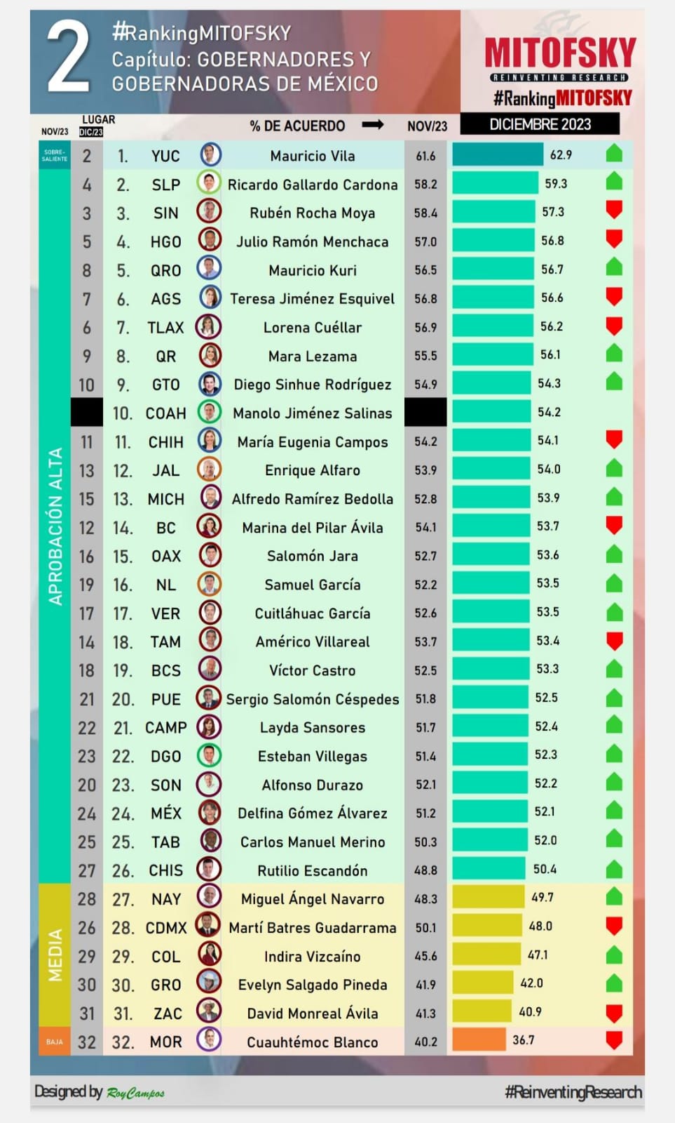 Fue publicado el Ranking Mitofsky en donde se evaluaron a los Gobernadores de México, donde muestra que en diciembre de 2023, en 21 entidades se registraron alza en aprobación, mientras que en 10 hubo caídas, descontando Coahuila, cuyo gobernador fue evaluado por primera vez en diciembre pasado.