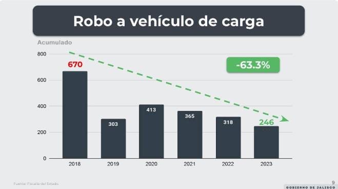 De 2018 a 2023 bajaron los robos a vehículos de carga pesada 63.3 por ciento en Jalisco, de acuerdo con datos del Gobierno Federal.