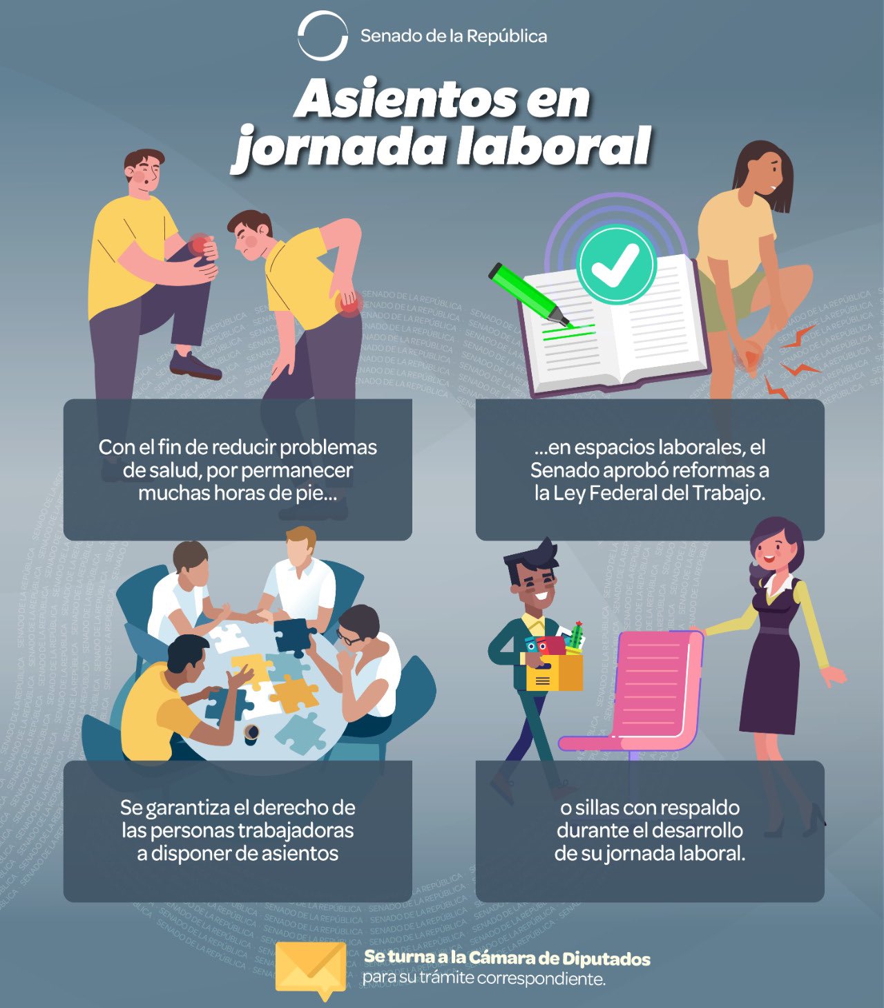 Por unanimidad, la Cámara de Senadores aprobó la llamada Ley Silla, una reforma a la Ley Federal del Trabajo que busca garantizar el derecho al descanso de los trabajadores durante su jornada laboral.