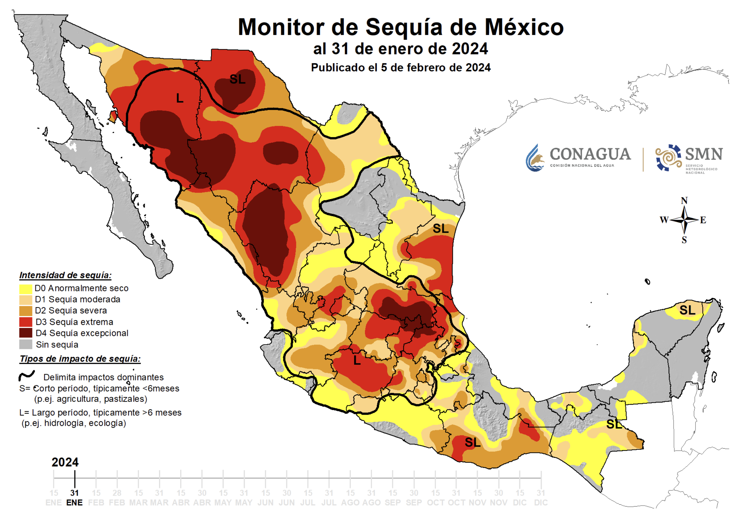 Según información del Monitor de Sequía en México (MSM), varios estados del país se verán afectados gravemente por la sequía, siendo los estados más afectados: Durango, Chihuahua, Querétaro, San Luis Potosí, Sonora y una parte de Hidalgo.