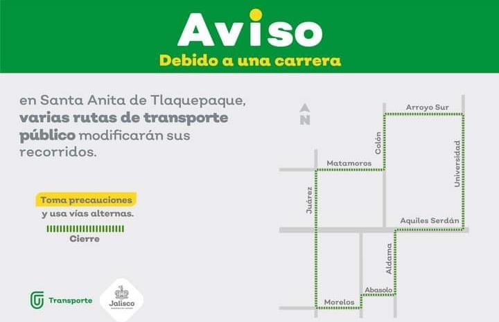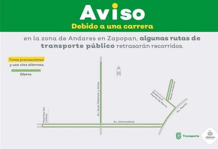 Las rutas de transporte público que se detendrán, al paso de los participantes, serán las siguientes: En la avenida Patria en el sentido de norte a sur, entre boulevard Puerta de Hierro y la avenida Universidad, pausarán las rutas C120, C121A, C121B, C136, C43 Arco del Triunfo, C54, C71, T17, T17-1, T17-C01 y 710 Parques de Tesistán.