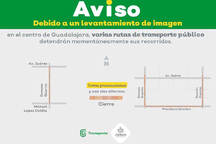 Debido a la elaboración de un largometraje en el corazón de la perla tapatía, el domingo 18 y el lunes 19 de febrero, algunas rutas de transporte público, que acostumbran pasar por esta zona, se verán obligadas a interrumpir su circulación por algunos intervalos del día.