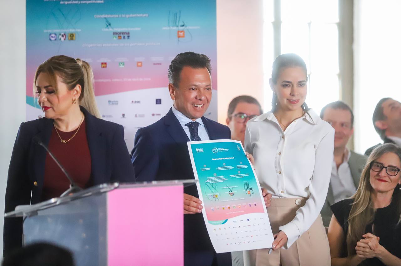 Sin mencionarla, pero en alusión a su rival morenista, Claudia Delgadillo González, el candidato emeceista recalcó: “Hoy vengo a ratificar este acuerdo, por supuesto, a suscribirlo como lo dije, sin condicionamientos. Su contrincante de Sigamos Haciendo Historia este lunes retó al IEPC a firmar otro pacto para no permitir la violencia de género ni a tener favoritismos.
