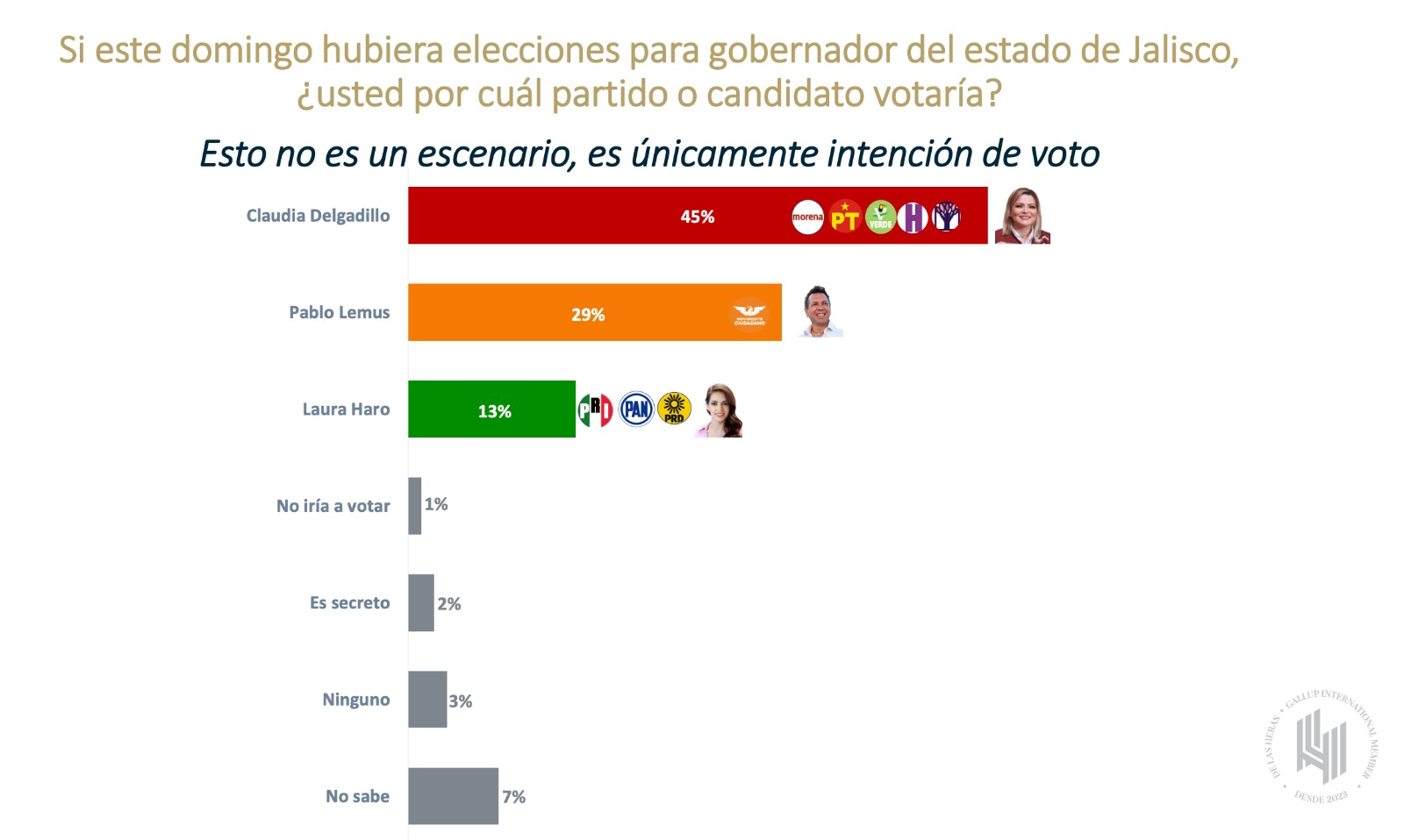 Los resultados arrojaron que Claudia Delgadillo ganaría con el 45 por ciento de los votos, mientras que en segundo lugar estaría Pablo Lemus, con un voto del 29 por ciento; es decir, 13 puntos porcentuales abajo.