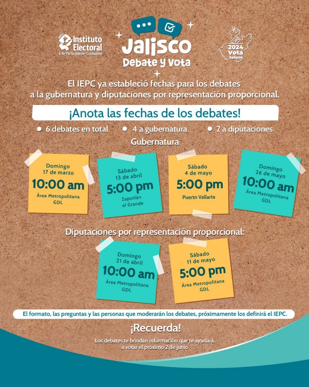 El segundo debate entre candidatos a la gubernatura será este sábado 13 de abril a las 17:00 horas. Tendrá como sede Zapotlán el Grande. Puedes seguir la transmisión en vivo en redes sociales de Tráfico ZMG.