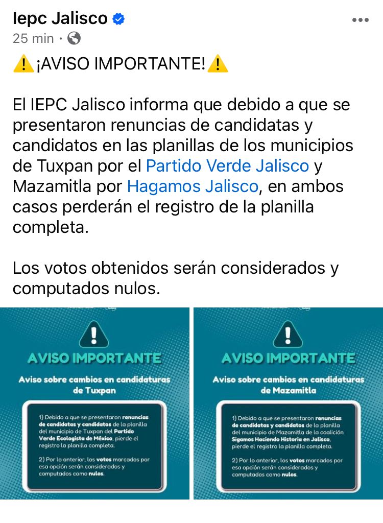 A unos días de la elecciones, el Instituto Electoral y de Participación Ciudadana (IEPC) en Jalisco confirmó que renunciaron a sus aspiraciones candidatas y candidatos en las planillas de los municipios de Tuxpan por el Partido Verde Ecologista de México (PVEM) y en Mazamitla por el partido Hagamos Jalisco.
