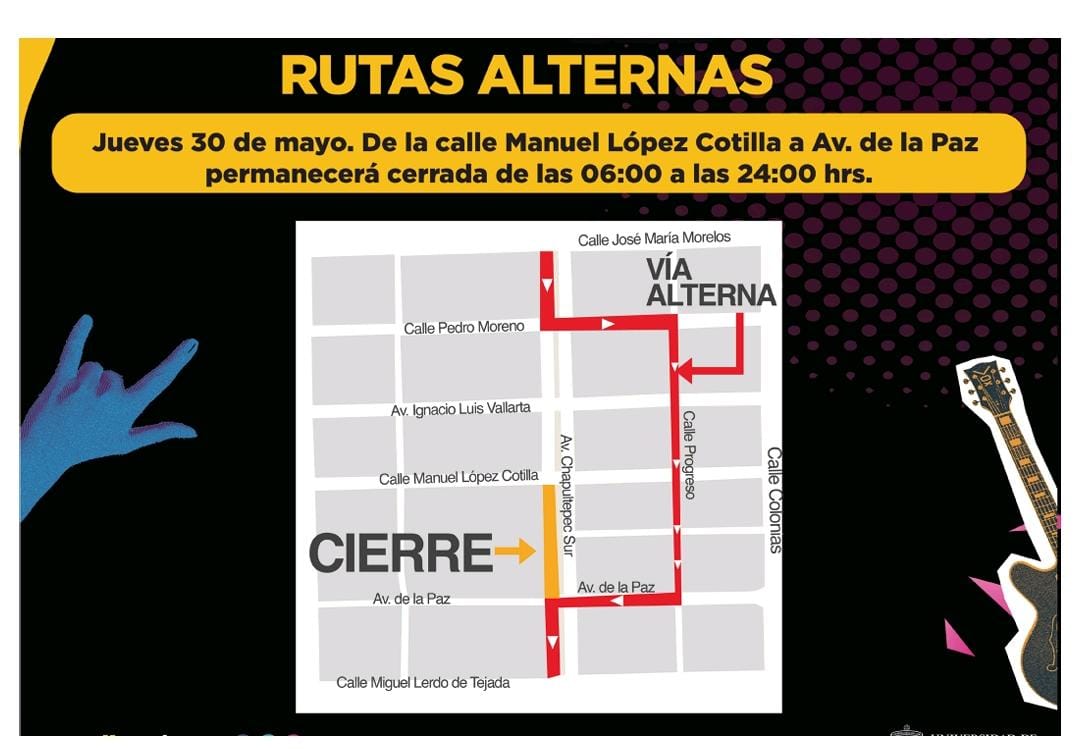 El cierre durará seis horas, mientras tanto la ruta alterna comienza desde Pedro Moreno, dirigiéndose hacia la calle Progreso. A partir de la avenida La Paz será posible reincorporarse a Chapultepec.