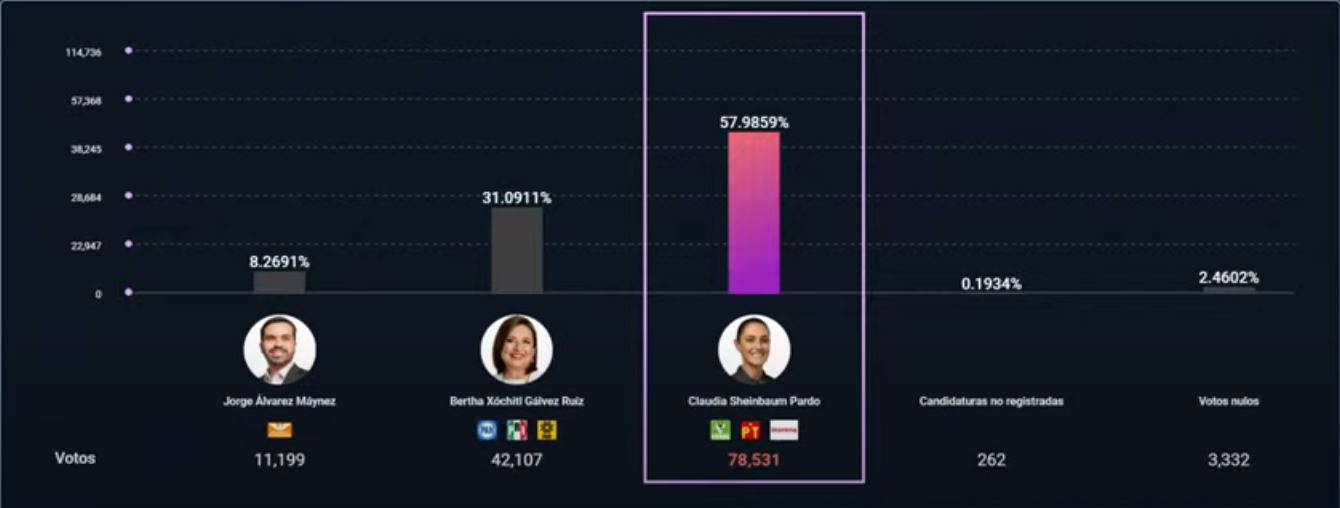 Mediante sus redes sociales, el INE compartió que el partido político que se proyecta como el ganador es Morena y su candidata Claudia Sheinbaum, con 44.2807 por ciento de los votos, lo que son 50,806 votos; contando los partidos con los que tenían alianza, tendrían 57.0413 por ciento, sumando 65,447 votos a su favor. Detrás se encontraría la opositora Xóchitl Gálvez con el partido Plan Acción Nacional (PAN), con el 17.7337 por ciento y 20,347 votos, sumando los votos con los que se hizo alianza, tendría el 32.0100 por ciento y 36,727 votos. Al final estuvo el contrincante Jorge Álvarez Máynez, con el partido Movimiento Ciudadano (MC), sumando 8.2450 por ciento y 9,460 votos.