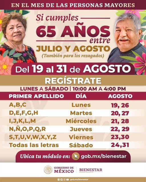 Se informó que del 19 al 31 de agosto se abrirá el registro de incorporación a la Pensión para el Bienestar de las Personas Adultas Mayores para quienes cumplen 65 años o más entre julio y agosto de 2024. Así lo dio a conocer Katia Meave Ferniza, delegada de la Secretaría Bienestar en Jalisco.