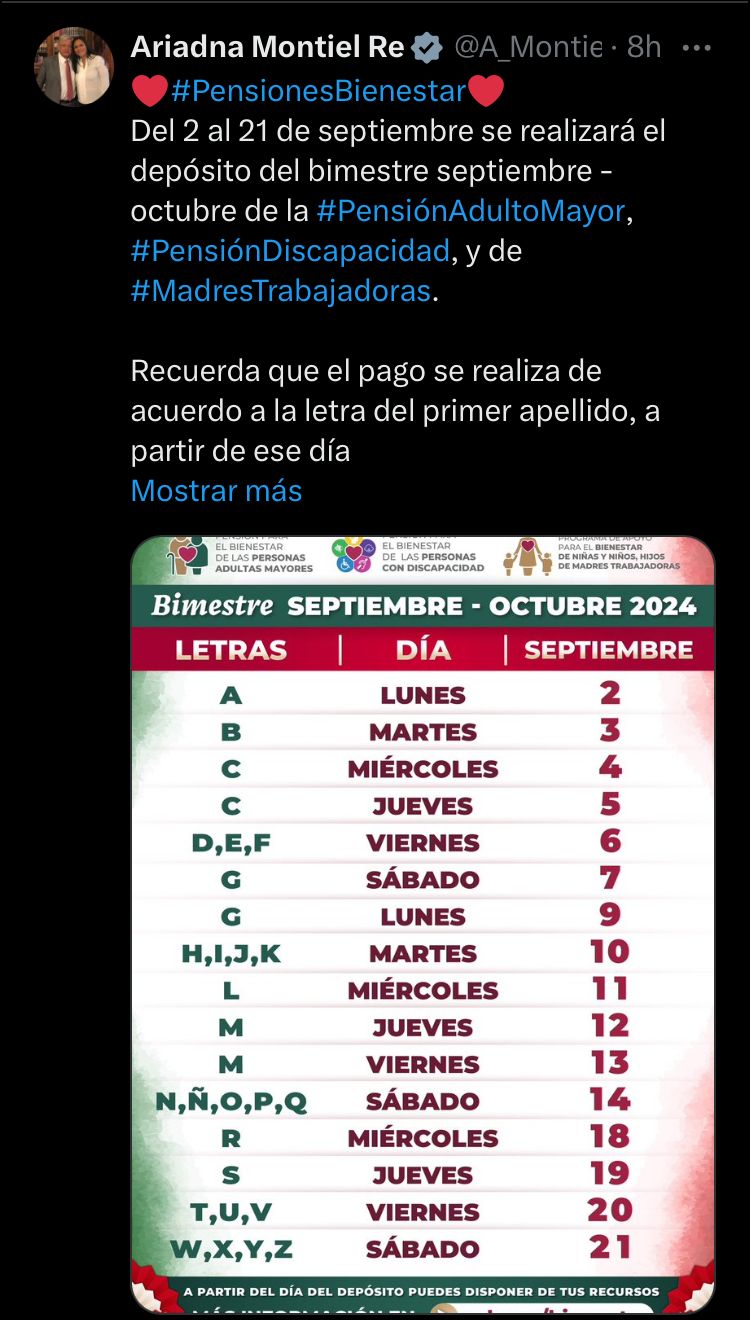 La titular de la Secretaría del Bienestar, Ariadna Montiel, publicó en redes sociales el calendario para la liberación de pagos a adultos mayores, personas con discapacidad y madres trabajadoras que son beneficiarias de Pensión Bienestar.