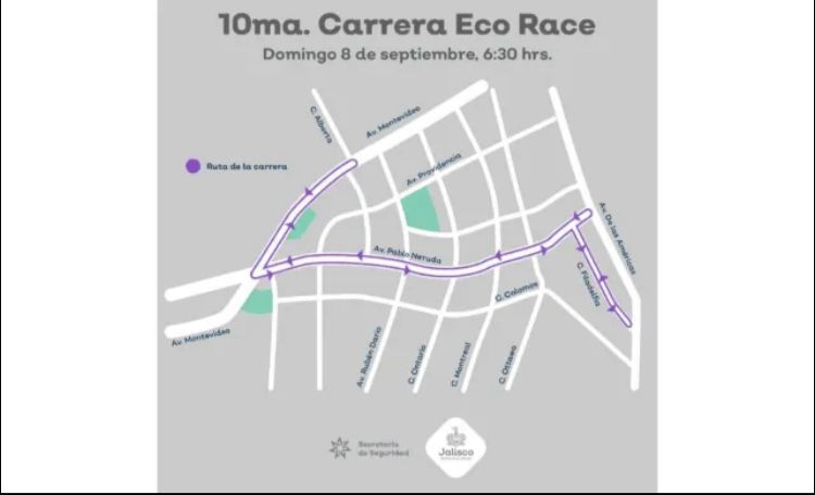 La segunda carrera tendrá lugar en la colonia Providencia del municipio de Guadalajara; el recorrido iniciará en la calle Managua, avanzará hacia el oriente en el sentido de la circulación vehicular, en la calle Filadelfia girará a la izquierda hasta la avenida Pablo Neruda donde dará vuelta a la derecha y poco antes de arribar a la avenida de las Américas se retornarán por la misma vialidad; los participantes continuarán hasta la avenida Montevideo, en ésta girarán a la derecha, avanzarán hasta la calle Alberta para retornar hacia el poniente, seguirán por esta misma vía hacia la avenida Pablo Neruda, donde continuarán su recorrido hasta la calle Filadelfia, girarán a la derecha y al llegar nuevamente a la calle Managua se encontrarán con la meta.