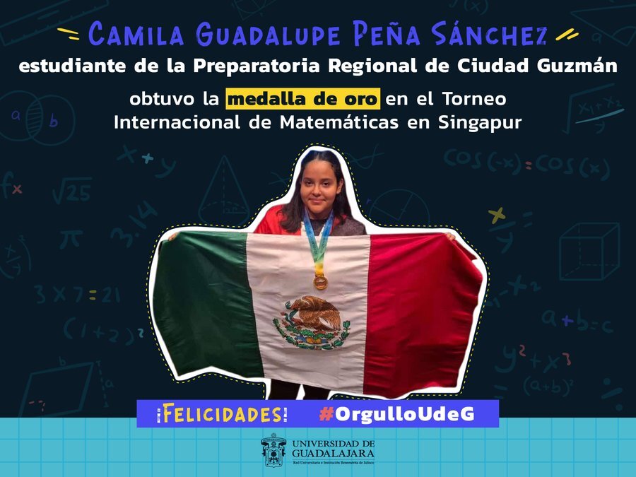 “¡Qué bonito es ver a nuestros jóvenes cumplir sus sueños! Camila Guadalupe Peña, estudiante de la Preparatoria Regional de Ciudad Guzmán, viajó a Singapur al Torneo Internacional de Matemáticas y logró ganar la medalla de oro en la competencia individual en la categoría G10. ¡Muchísimas felicidades Camila! Eres un gran ejemplo de disciplina para toda la comunidad universitaria y además eres un #OrgulloUdeG”, compartió.