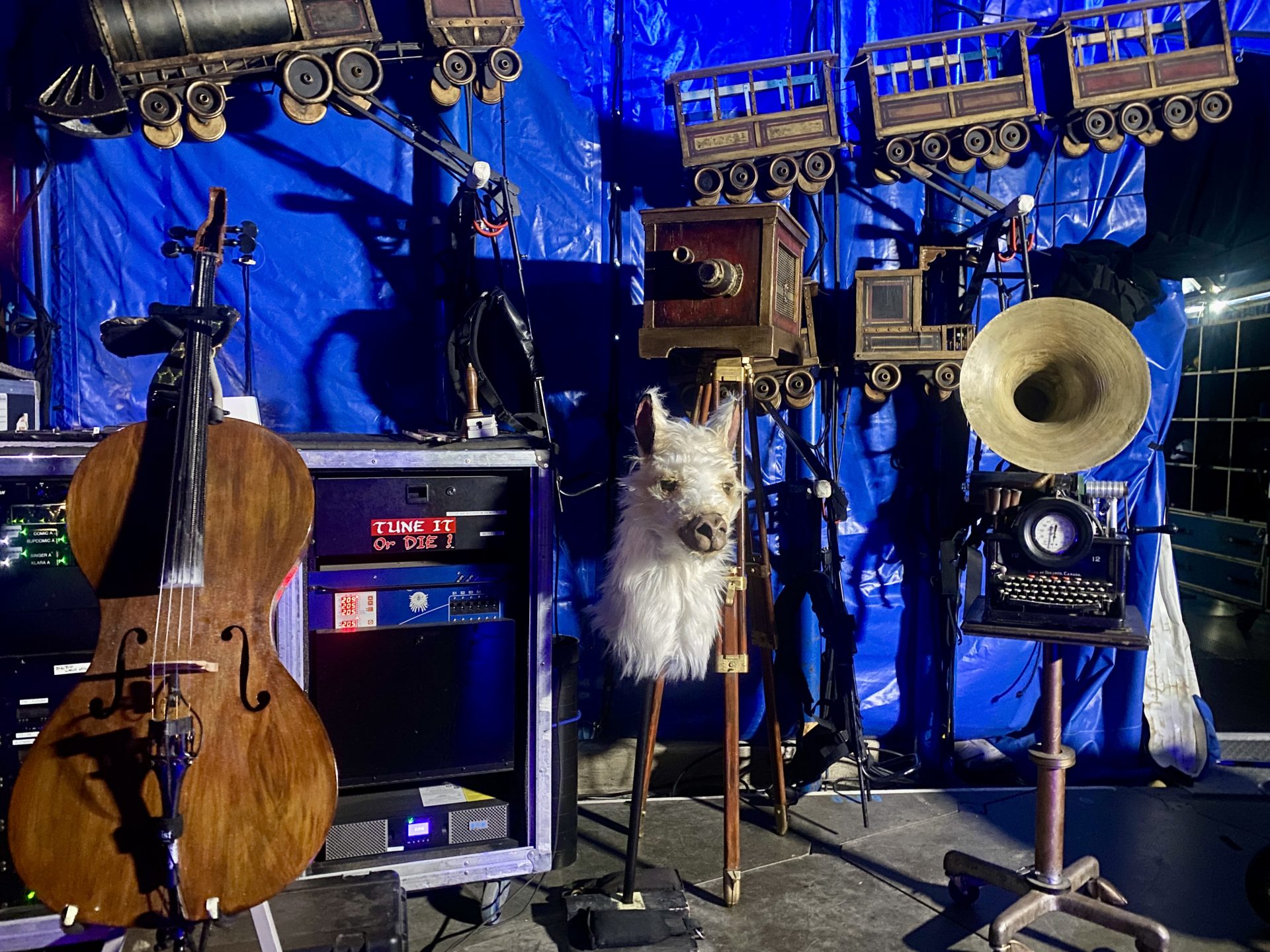 «Kurios» es el espectáculo del Cirque du Solei con mayor número de utilería (475 objetos). Puedes ver increíbles piezas, como el tren de vapor, la cámara fotográfica, un megáfono, una máquina de escribir y una mano mecánica que es operada por dos técnicos. Pesa 340 kilos y es una de las invenciones más grandes del show. Se necesitan dos o tres artistas para agarrar uno de los dedos.