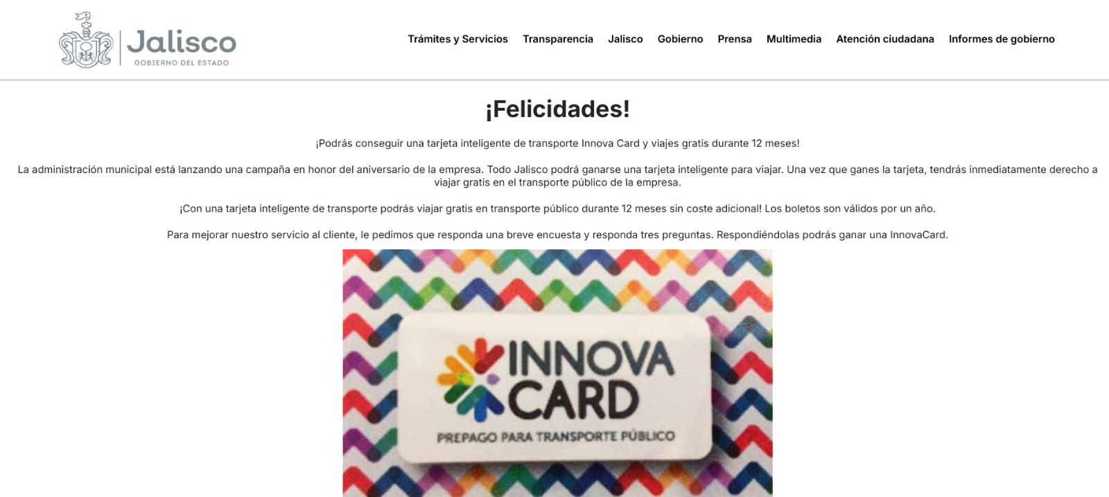 En cada una de los post, se incluye un enlace para tramitar la supuesta tarjeta, que dirige a un sitio apócrifo del Gobierno de Jalisco (storeplayground.com). En dicho sitio, tras felicitar al usuario, se explica que “la administración municipal está lanzando una campaña en honor del aniversario de la empresa. Todo Jalisco podrá ganarse una tarjeta inteligente para viajar. Una vez que ganes la tarjeta, tendrás inmediatamente derecho a viajar gratis en el transporte público de la empresa”.