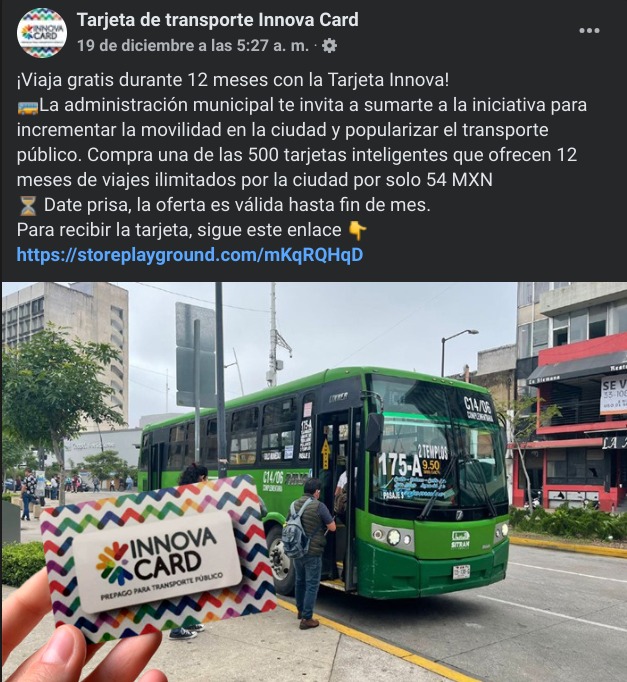 Además, el mensaje afirma: “La administración municipal te invita a sumarte a la iniciativa para incrementar la movilidad en la ciudad y popularizar el transporte público. Compra una de las 500 tarjetas inteligentes que ofrecen 12 meses de viajes ilimitados por la ciudad por solo 54 MXN. Date prisa, la oferta es válida hasta fin de mes”.