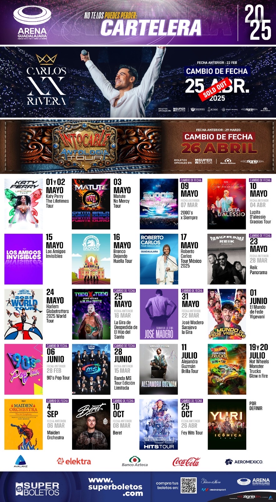 La inauguración de la Arena Guadalajara, originalmente programada para el 22 de febrero con un concierto de Carlos Rivera, se reprogramó para el 25 de abril de 2025. Según un comunicado oficial, este ajuste permitirá optimizar el recinto y garantizar un espacio más cómodo, seguro y tecnológico.