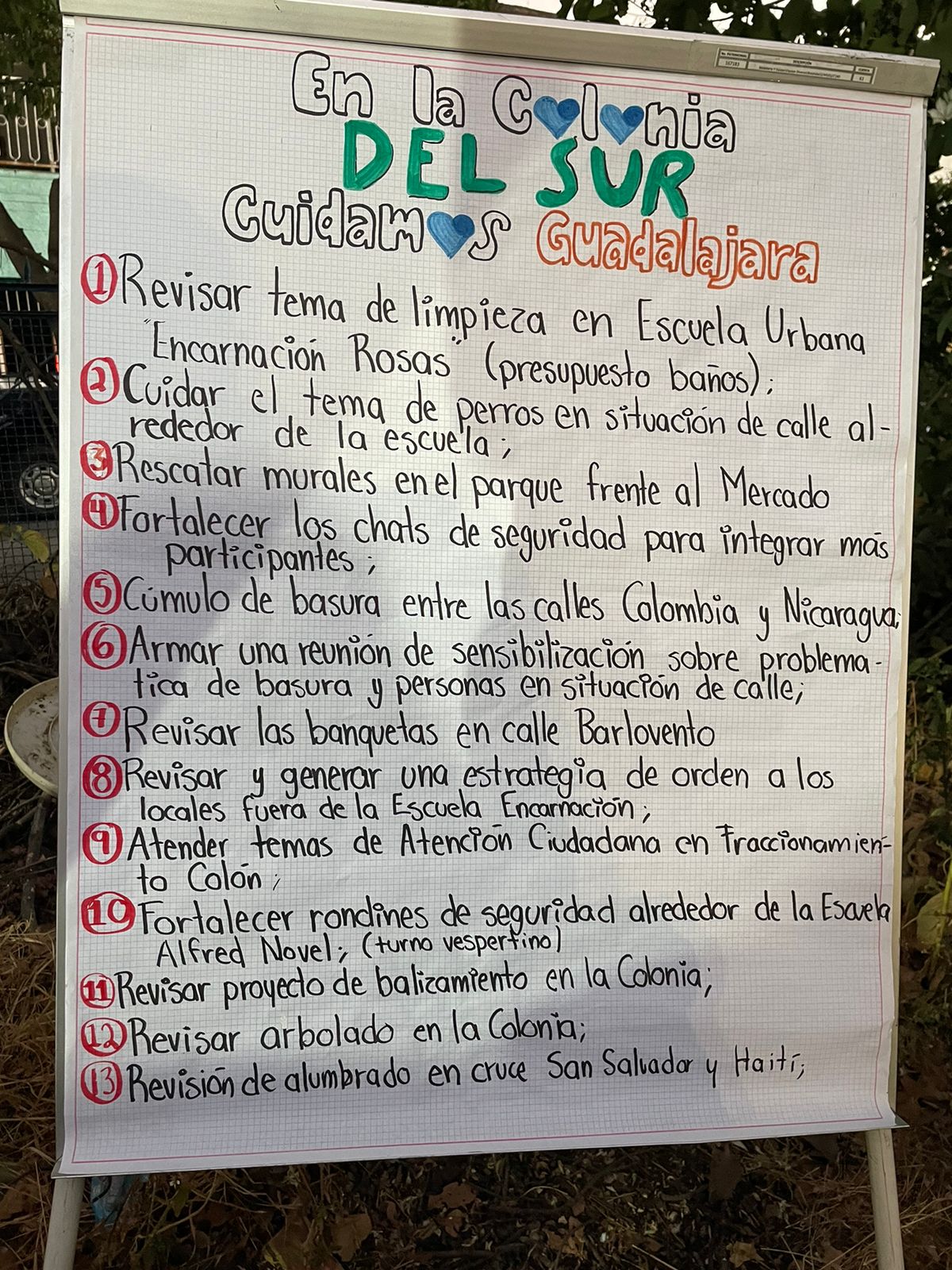 Durante el Martes Comunitario, la alcaldesa hizo 13 acuerdos con los habitantes de la zona para mejorar el entorno. Entre ellos destaca el estudio al estado en que se encuentra el arbolado de la zona, reforzamiento de limpieza en calles y banquetas, una política de bienestar animal para atender a perros callejeros en los alrededores de la escuela Encarnación Rosas, rescate de murales en el mercado, el fortalecimiento de los chats vecinales y el balizamiento de cruceros.