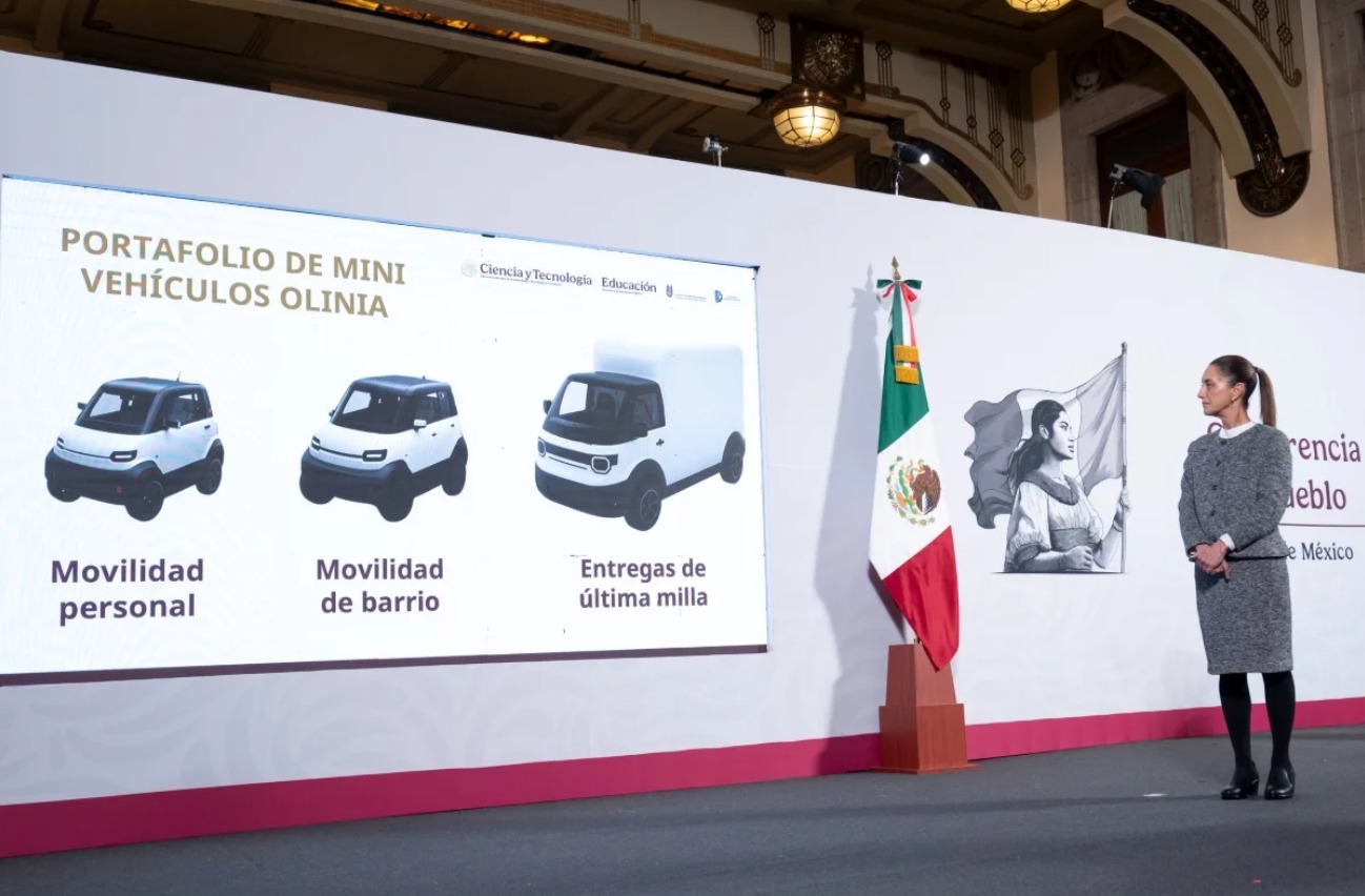 La presidenta de México, Claudia Sheinbaum, presentó el proyecto de Olinia, la primera armadora mexicana de minivehículos eléctricos, que busca desarrollar tres modelos para 2030 con precios accesibles de entre 90 y 150 mil pesos. “Es esta red de autos eléctricos que queremos construir, 100 % mexicanos; ya está el proyecto, la estrategia”, declaró Sheinbaum en su conferencia matutina.