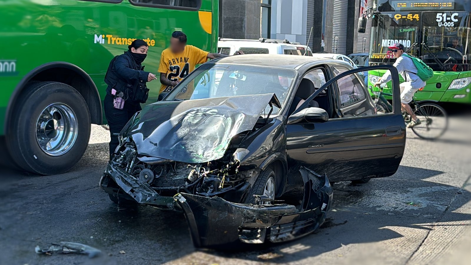 Un impactante percance vial con dos vehículos involucrados bloqueó el paso a la circulación de la Calzada Independencia Sur, en dirección al Parque Morelos. Las unidades, un autobús del Transporte Público y un automóvil particular, totalmente destruida la segunda por la parte de la defensa, luego del accidente derramaron aceite y fragmentos de plástico sueltos sobre la vía pública.